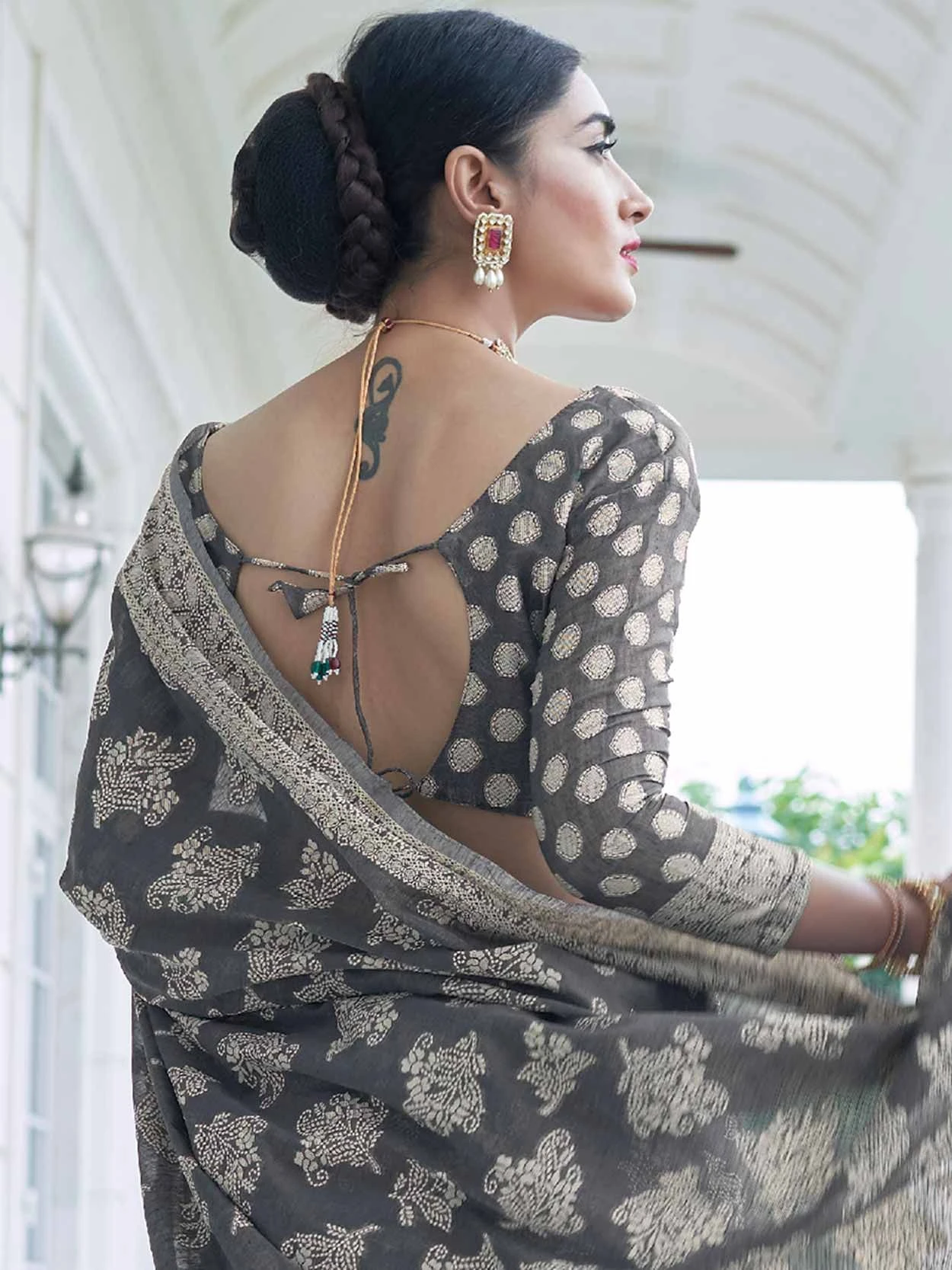 Glam up sweetly adorning this grey color party wear saree crafted in silk. Furnished using traditional themed chikankari patterns, showcasing distinstive borders and pallu. Comes with a matching grey color blouse in silk. Please keep in mind that the accessories featured are purely for fashion purposes. Due to photography reasons, some color variations may occur. The un-stitched blouse may be customized up to 42 inches.
