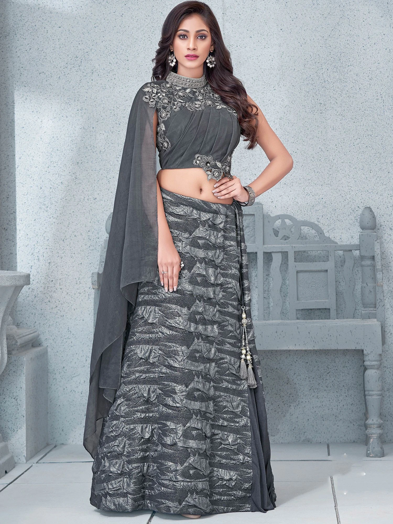 Spread the dazzling sparkles wearing this grey color tissue lehenga. Accompanied along with a tissue choli with fine embroidery work and comes with attached dupatta, both in matching grey color. The semi stitched choli can be customized up to 42 inches.. Note: The accessories featured are purely for fashion purposes. Due to photography reasons, some color variations may occur. The semi-stitched choli and lehenga waist may be customized up to 42 inches.