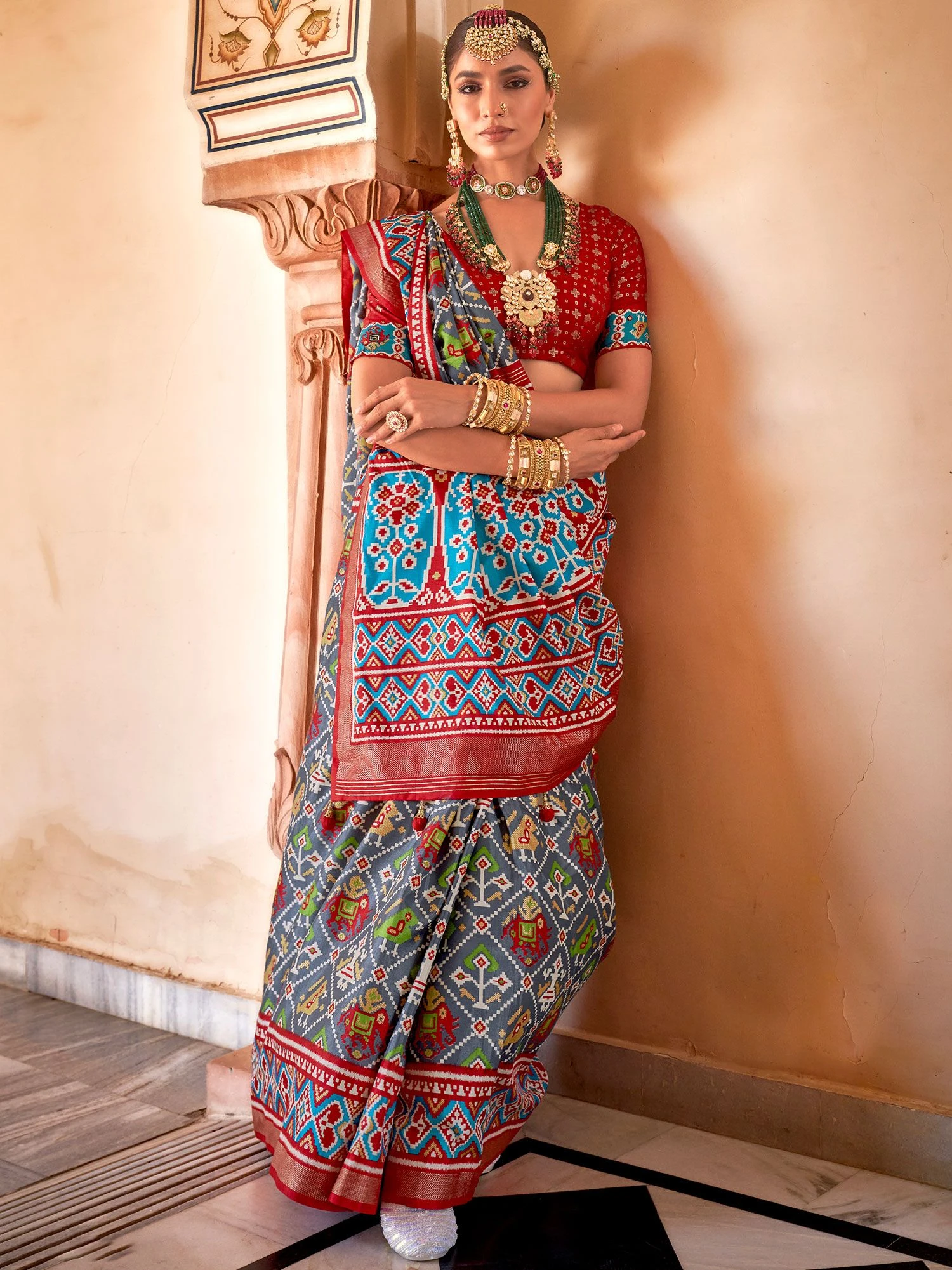 Evoke the diva in you wearing this sapphire blue color saree made in patola silk. Crafted using printed patola and woven patterns, showcasing distinstive borders and pallu. Teamed with a matching red color blouse in patola silk. Note: The accessories featured are purely for fashion purposes. Due to photography reasons, some color variations may occur. The un-stitched blouse may be customized up to 42 inches.