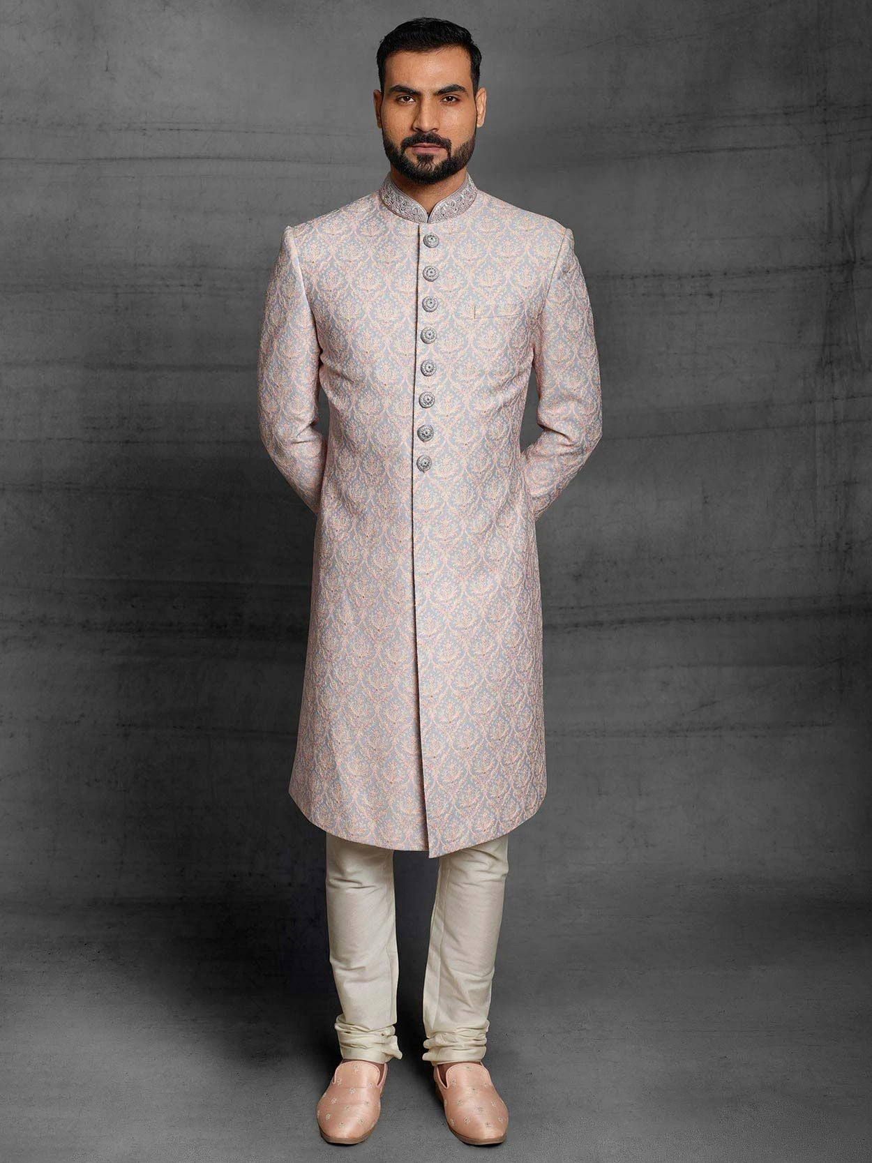 Get a desirable dynamism with this Grey,Peach Colour Jacquard,Silk Fabric Wedding Sherwani With Matching Anarkali Kurta With Churidar Pajama is embellished with Thread,Hand Work