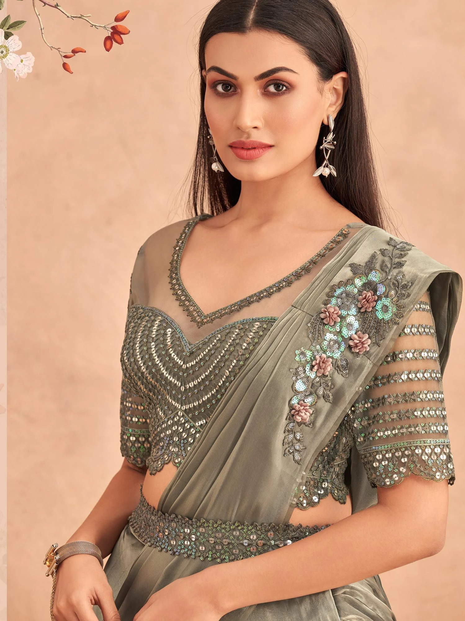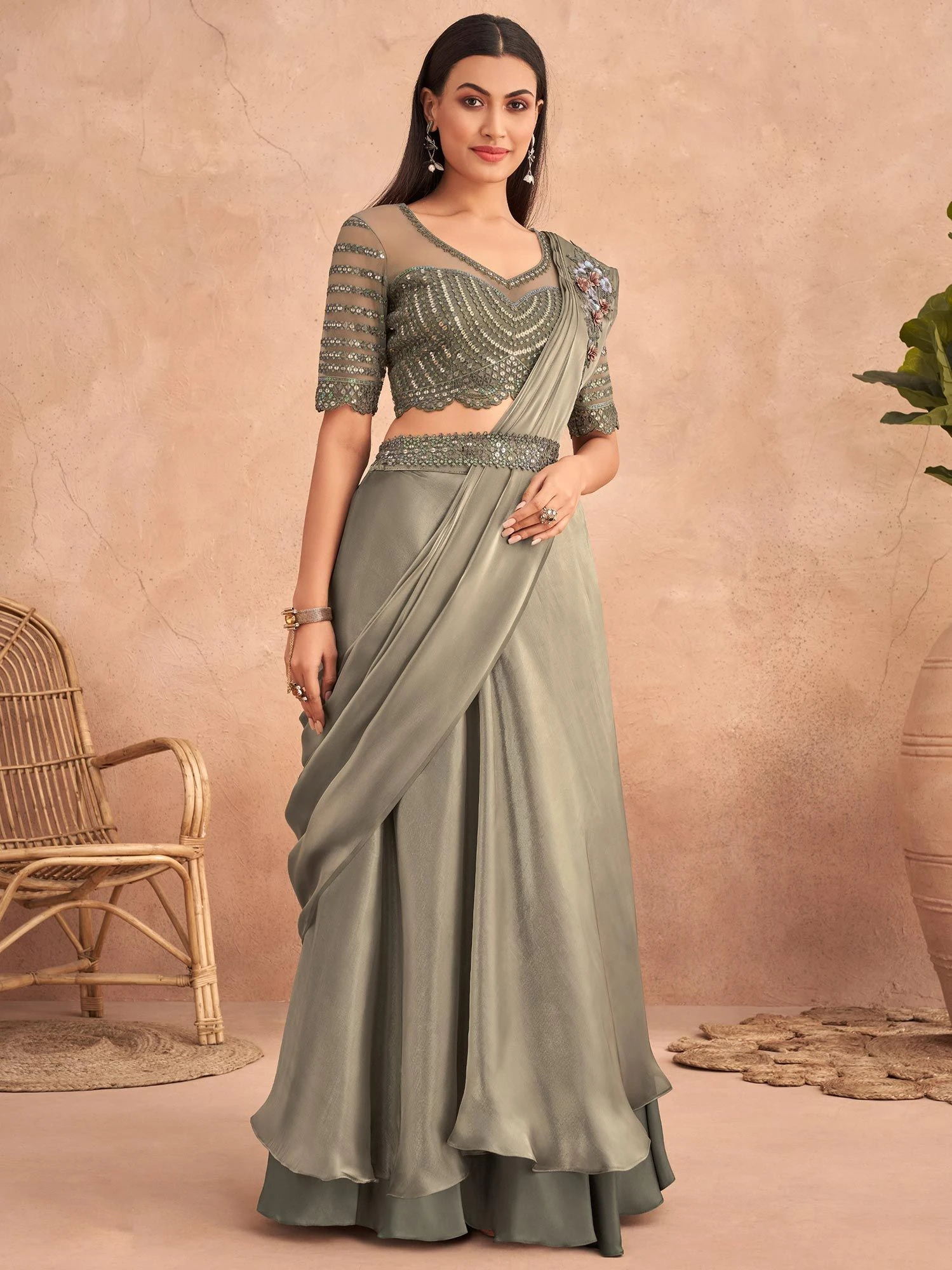 Cherish your feminine side wearing this soft grey color pre-stitched saree in satin. Designed using sequins and thread embroidered patterns, showcasing distinstive edges and waist. Teamed with a matching grey color embellished blouse in satin with net sleeves. Please Note: The accessories featured are purely for fashion purposes. Due to photography reasons, some color variations may occur. The un-stitched blouse may be customized up to 42 inches.