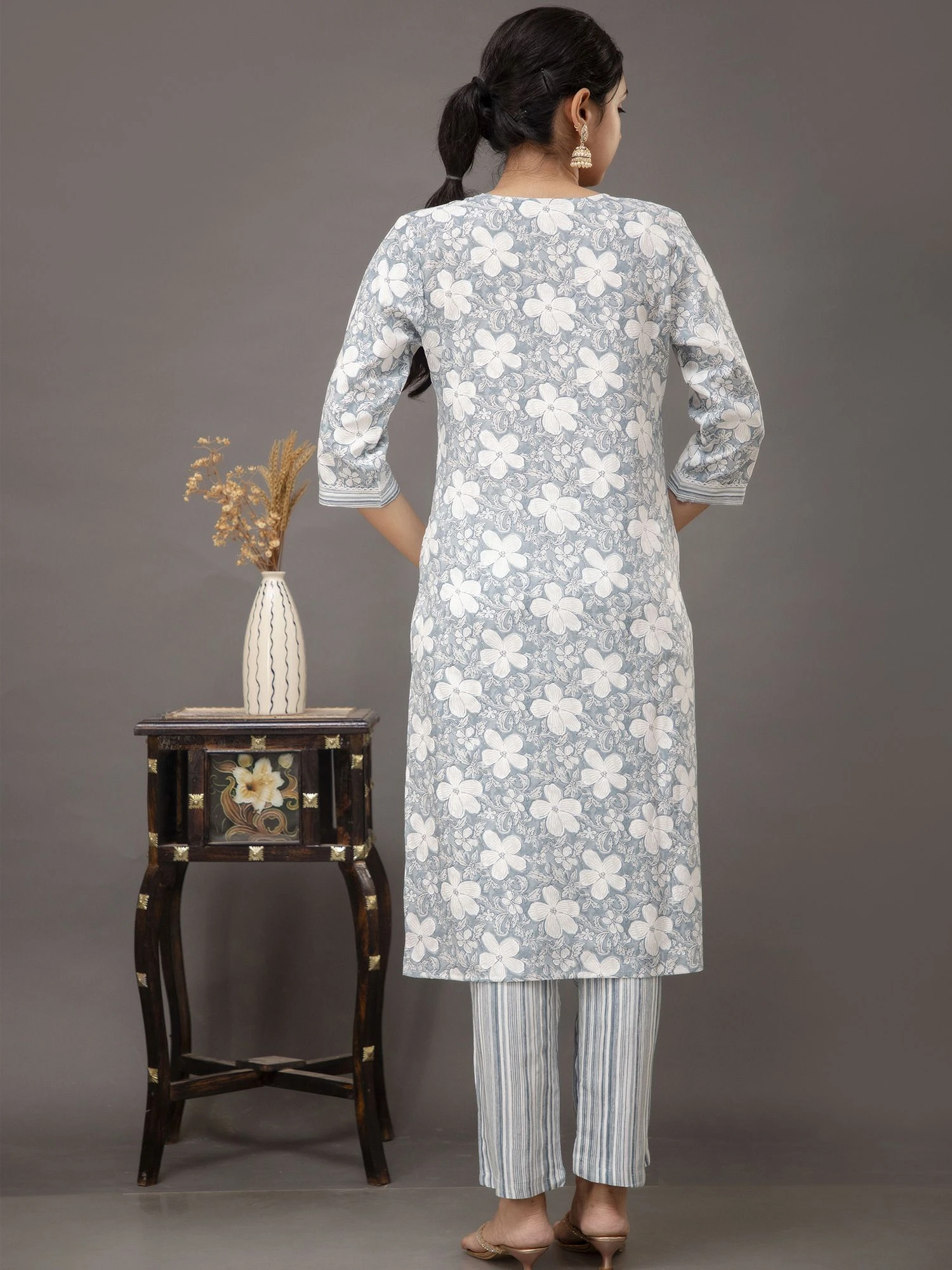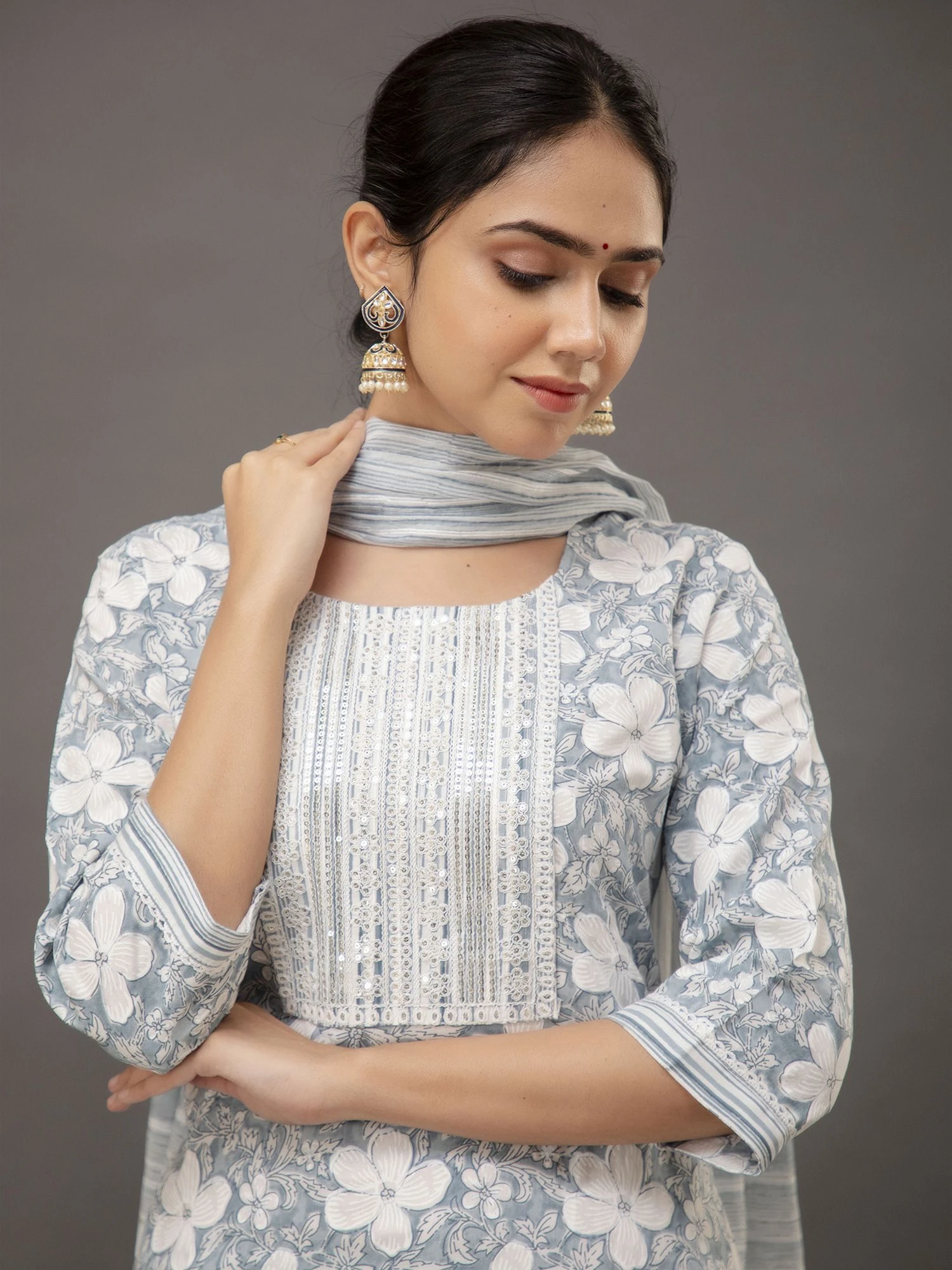 Exude major dreamy vibes with this cloud grey color straight cut kameez in cotton. Designed using sequins and thread work and floral print all over. Paired with a cotton dupatta and a pant style bottom, both made in grey color. Note: Accessories shown are for styling purpose only. Slight color variation may occur due to photographic reasons. The semi-stitched kameez can be customised upto 42 inches.