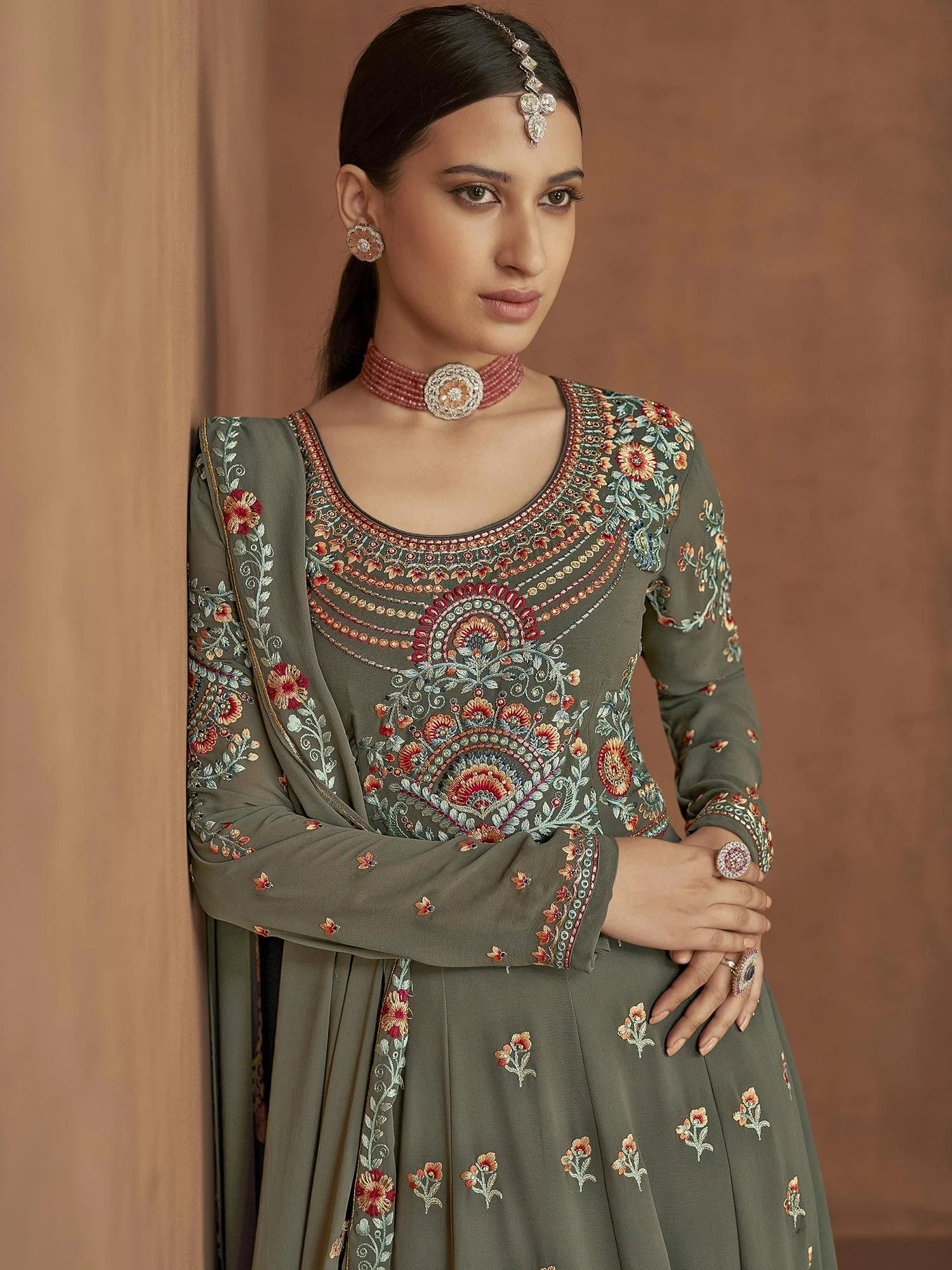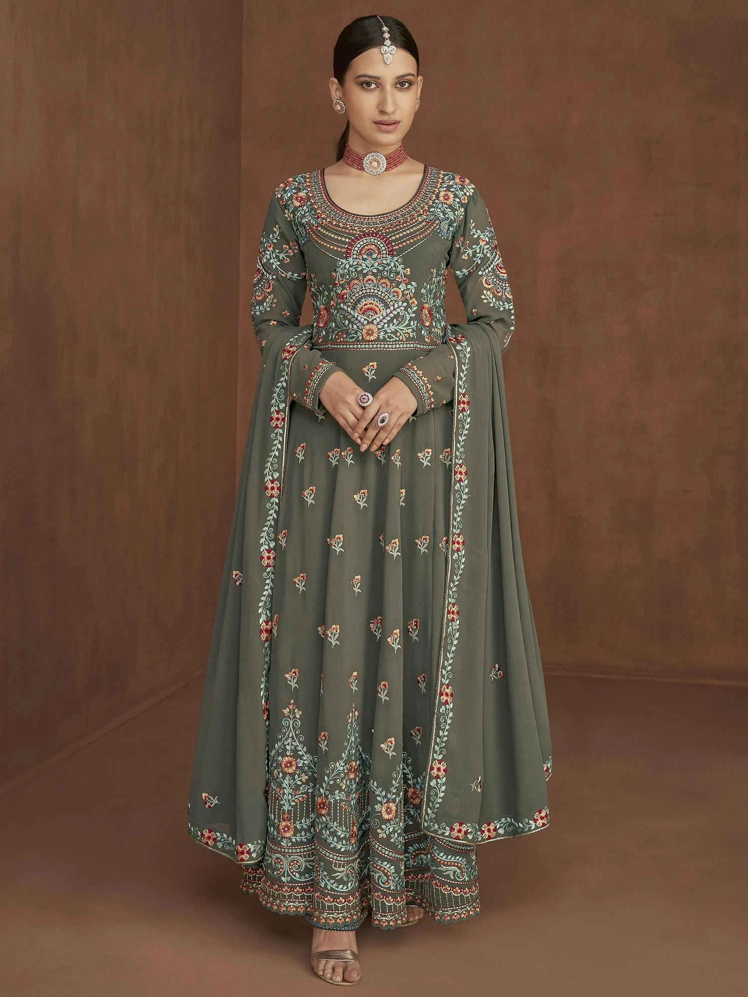 Stand out amongst the rest wearing this sardine grey color anarkali kameez in georgette. Designed using thread work embroidery with stones all over. Assembled with a matching georgette dupatta and a matching palazzo in shantoon. Note: Accessories shown are for styling purpose only. Slight color variation may occur due to photographic reasons. The semi-stitched kameez can be customised upto 42 inches.