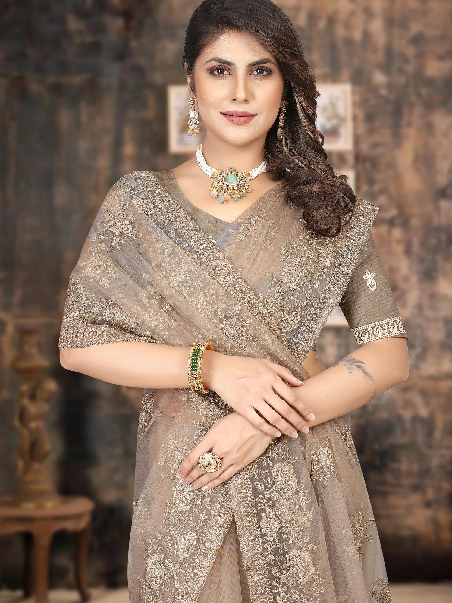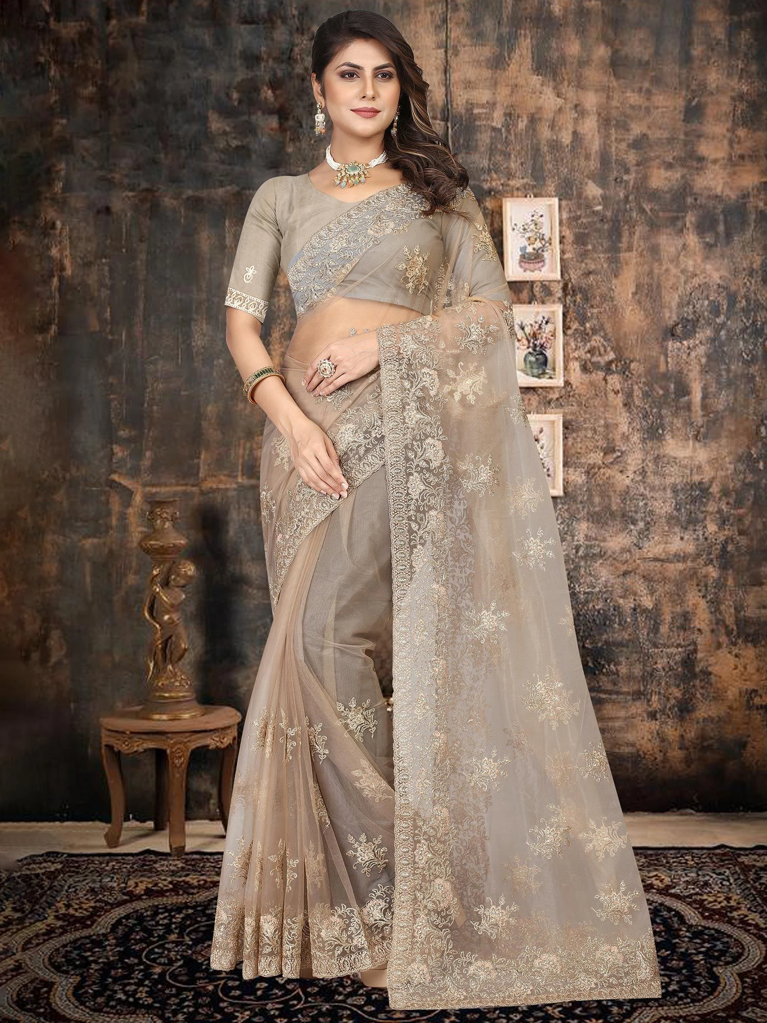 Look all stylish as you wear this stone grey color sari in net. Augmented using zari and thread embroidered patterns, showcasing distinstive borders and pallu. Teamed with a matching grey color embroidered blouse in net. Note: The accessories featured are purely for fashion purposes. Due to photography reasons, some color variations may occur. The un-stitched blouse may be customized up to 42 inches.