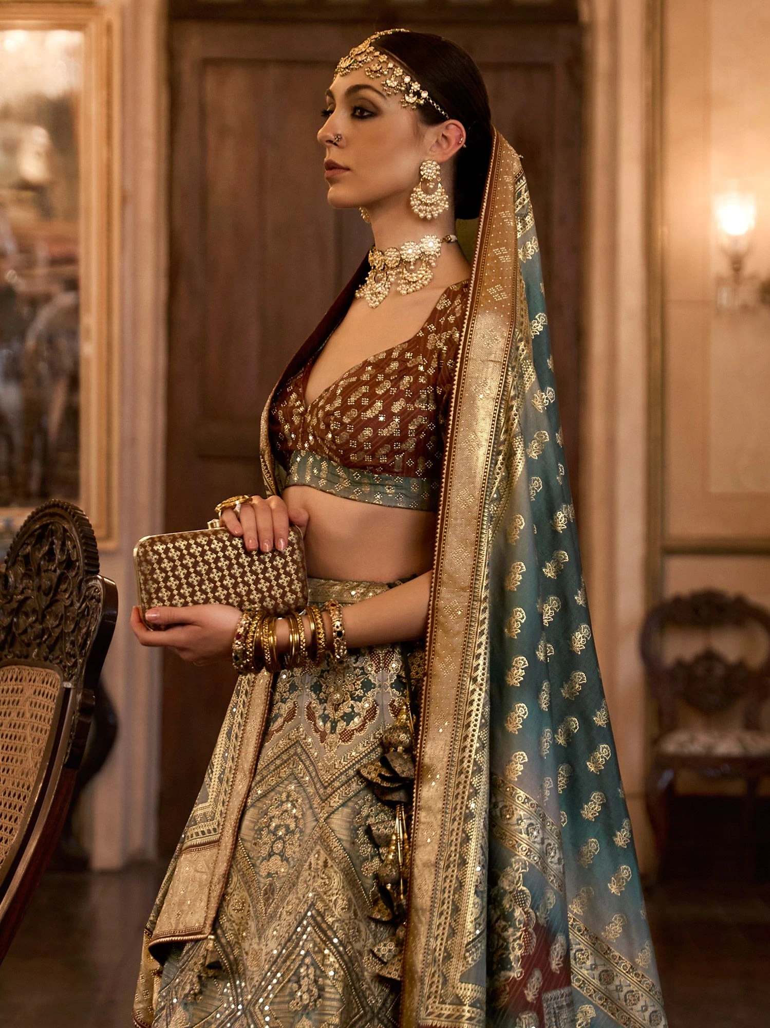 Charm the world in ethnic splendor wearing this grey bridal lehenga in silk. Crafted with sequins, stones and traditional woven detailings all over. Teamed with a brown color embellished choli and a grey shaded silk dupatta enhanced with matching work. Note: The accessories featured are purely for fashion purposes. Due to photography reasons, some color variations may occur. The semi-stitched choli and lehenga waist may be customized up to 42 inches.