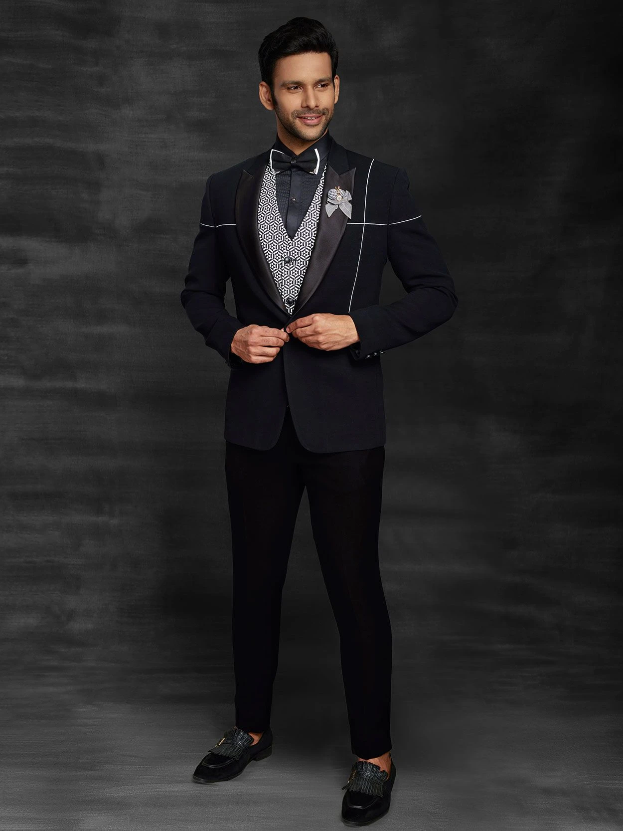 Black Colour Imported Fabric Designer Tuxedo Suit.