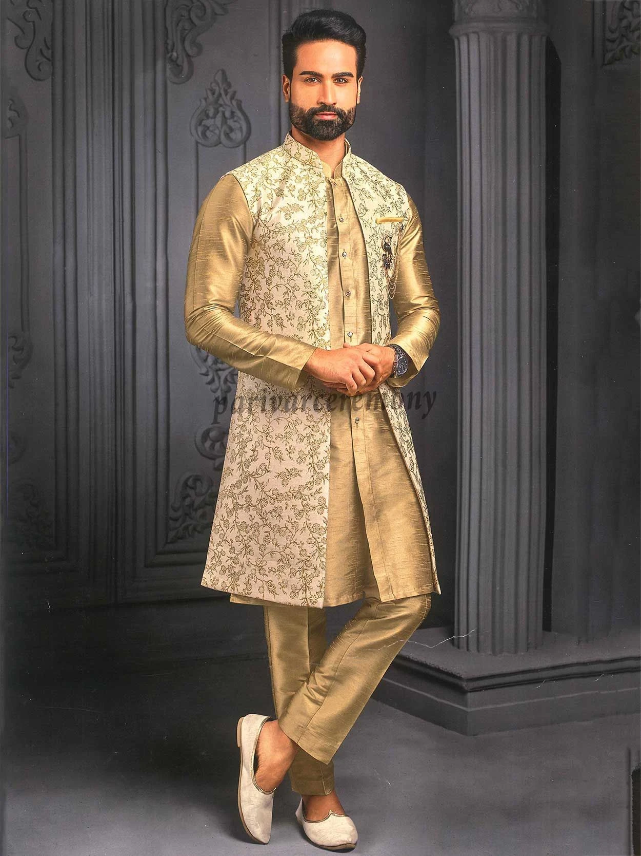 Get a simplistic and smart ethnic appeal in this Cream,Golden Colour Imported Fabric Readymade Kurta Pajama Jacket.