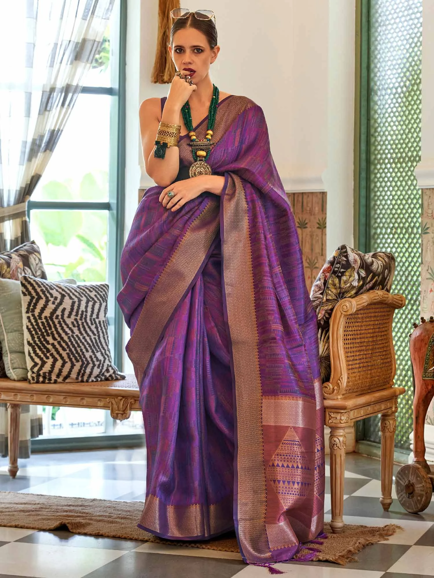 Evoke the diva in you wearing this heart purple color saree crafted in organza. Enhanced using woven patterns, showcasing distinstive borders and pallu. Comes with a matching brown color blouse in organza. Note: The accessories featured are purely for fashion purposes. Due to photography reasons, some color variations may occur. The un-stitched blouse may be customized up to 42 inches.