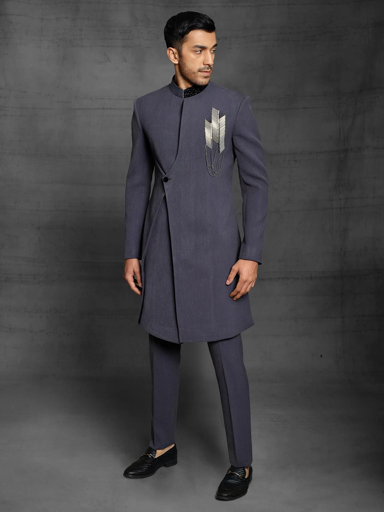 Add subtle glamour to the robust personality in this Light Blue Colour Imported Fabric Men’s Indowestern With Hand Work.
