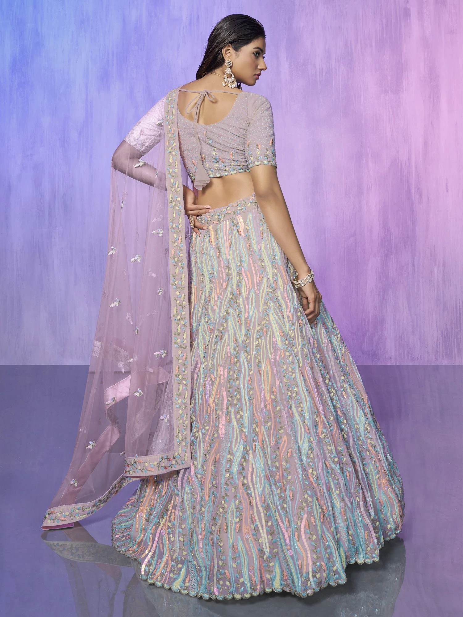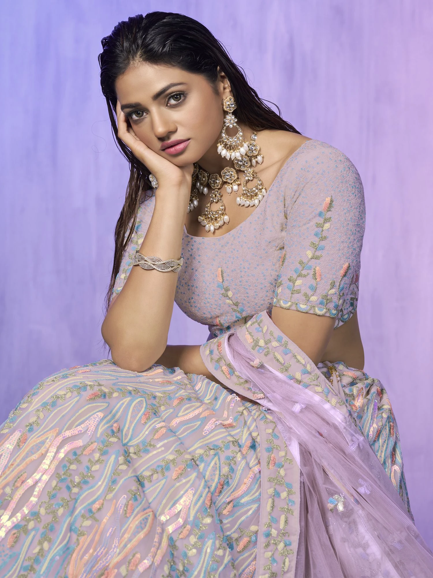 Casting a magical aura with every move wearing this lilac purple color designer lehenga in organza. Decorated with sequins, stone work with thread embroidered. Paired with a matching purple color embroidered choli in organza and purple color dupatta, made in net. Note: The accessories featured are purely for fashion purposes. Due to photography reasons, some color variations may occur. The semi-stitched choli and lehenga waist may be customized up to 42 inches.
