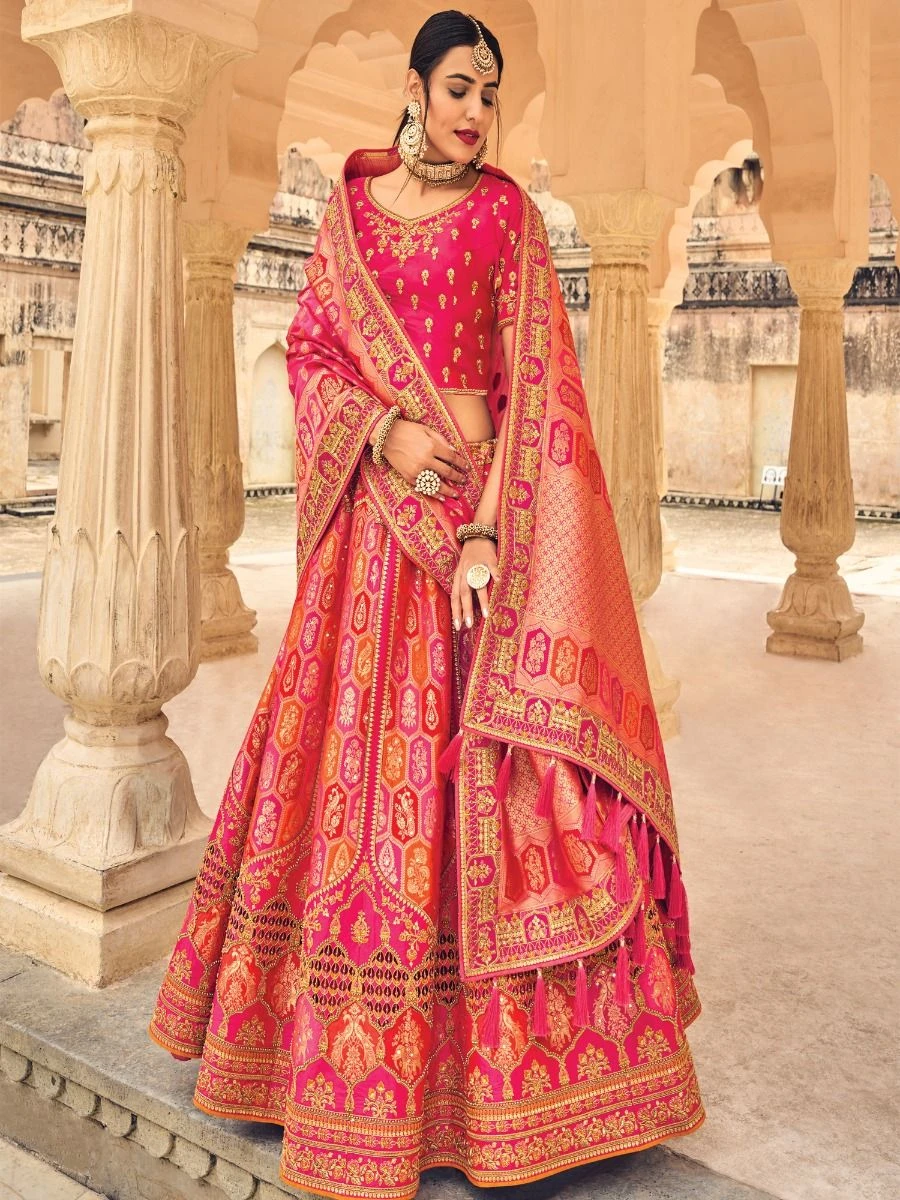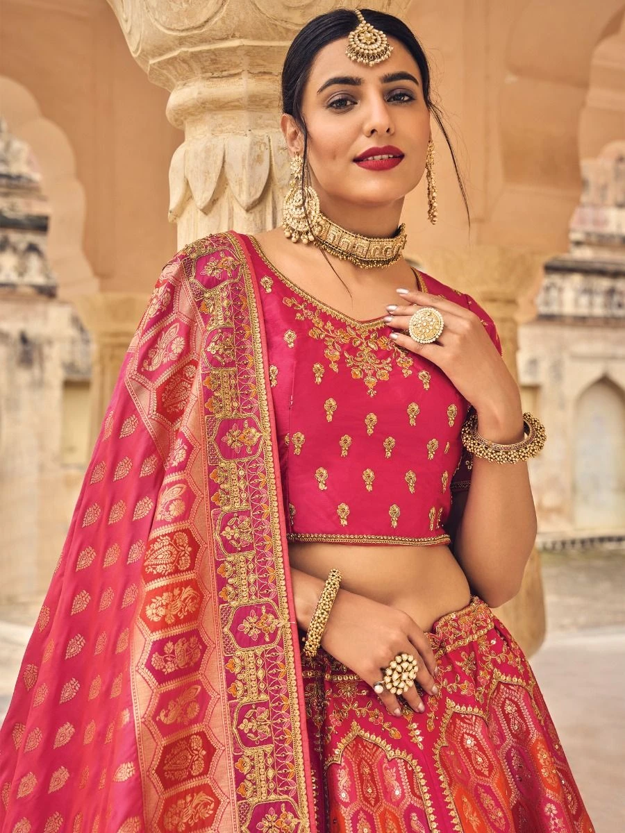 Here Elegance meets everlasting love wearing this punch pink color designer lehenga in banarasi silk. Elevated with sequins, stone and zari weaving with thread work embroidered work. Comes with a matching pink color embroidered choli in raw silk and pink color dupatta, made in banarasi silk. Note: The accessories featured are purely for fashion purposes. Due to photography reasons, some color variations may occur. The semi-stitched choli and lehenga waist may be customized up to 42 inches.