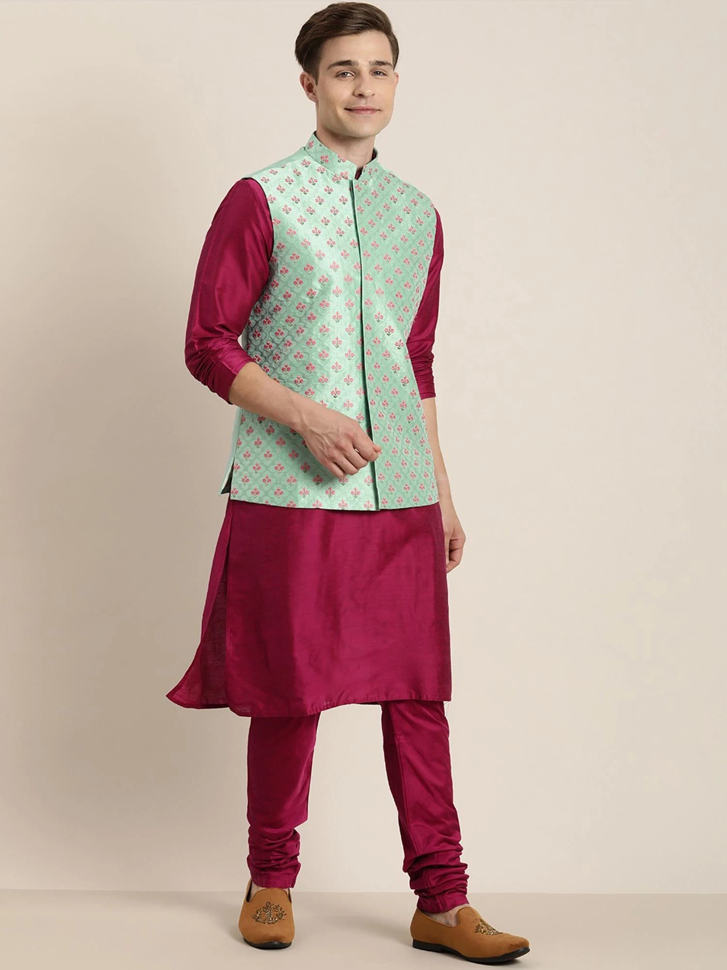Keep shinning bright adorning this magenta color kurta made in art silk. Topped with a green art silk nehru jacket enriched with thread embroidered details. Comes with a magenta color churidaar pants in art silk. Note: Some color variations may occur owing to photography causes. Up to 1 inch of measurement fluctuation is possible.