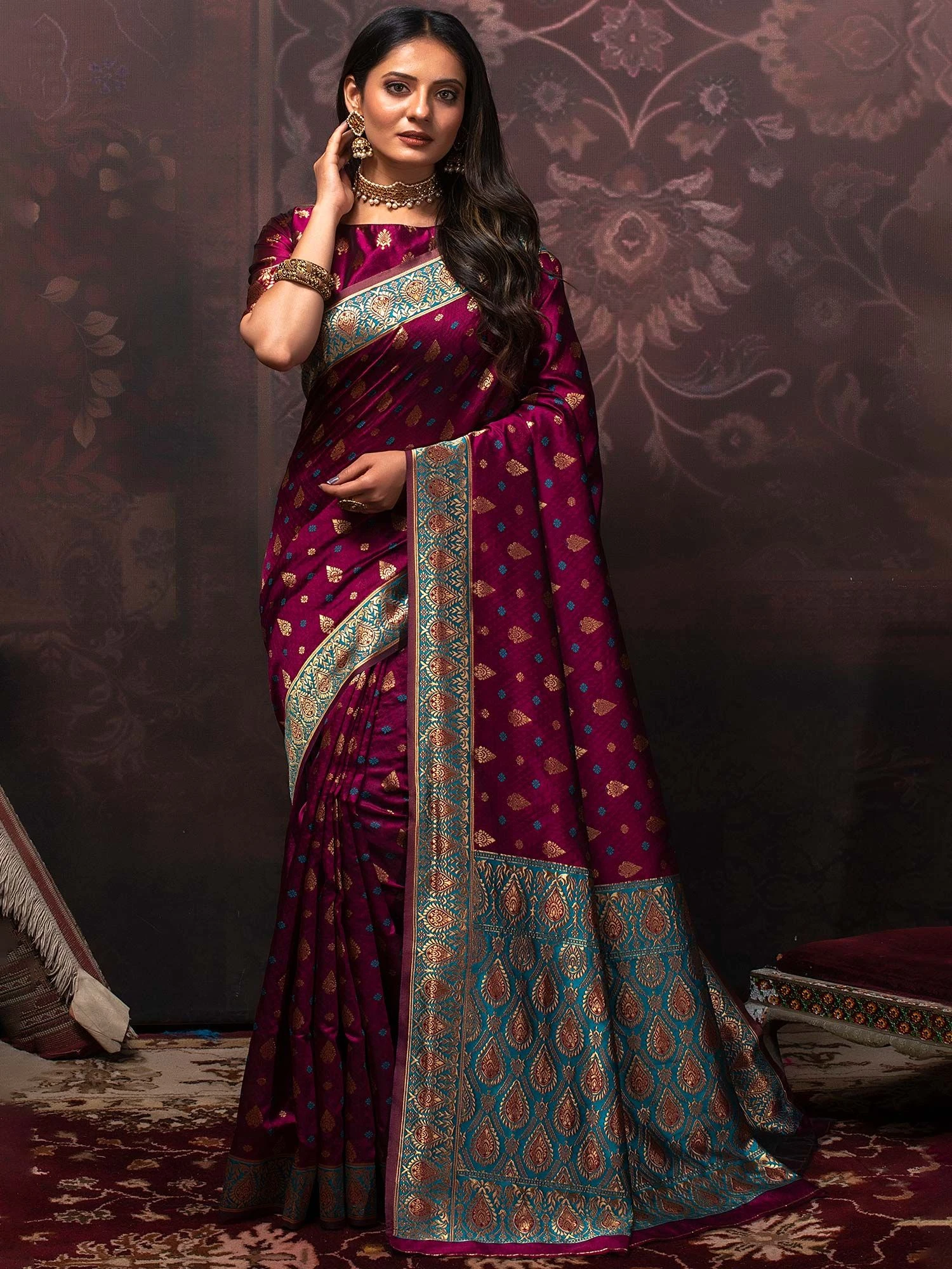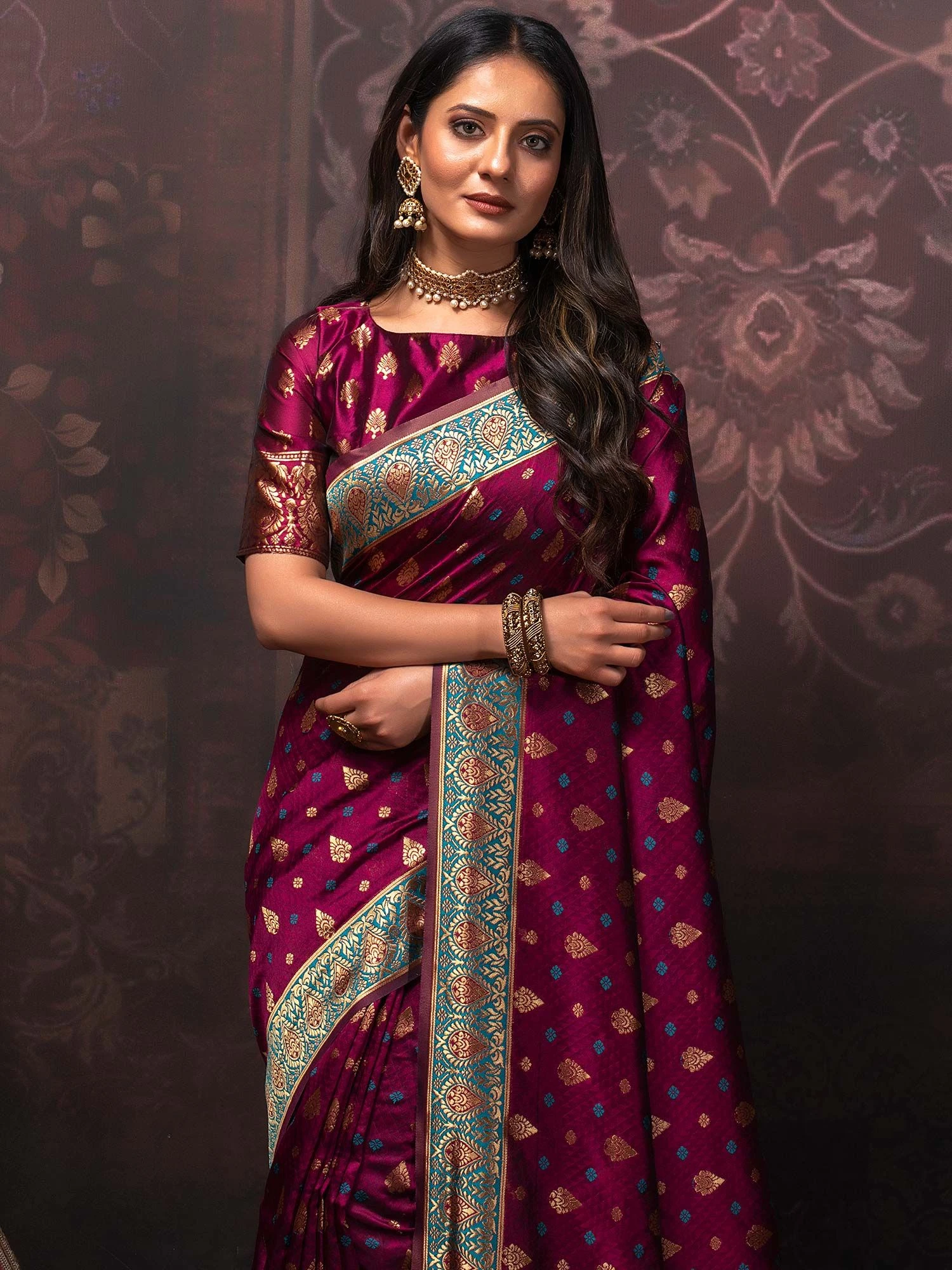Overwhelm the audience adorning this magenta color saree crafted in silk. Elevated using woven patterns, showcasing distinstive borders and pallu. Assembled with a matching magenta color blouse in silk. Note: The accessories featured are purely for fashion purposes. Due to photography reasons, some color variations may occur. The un-stitched blouse may be customized up to 42 inches.