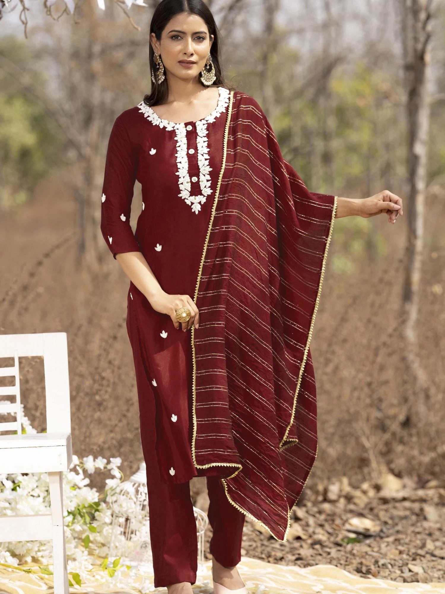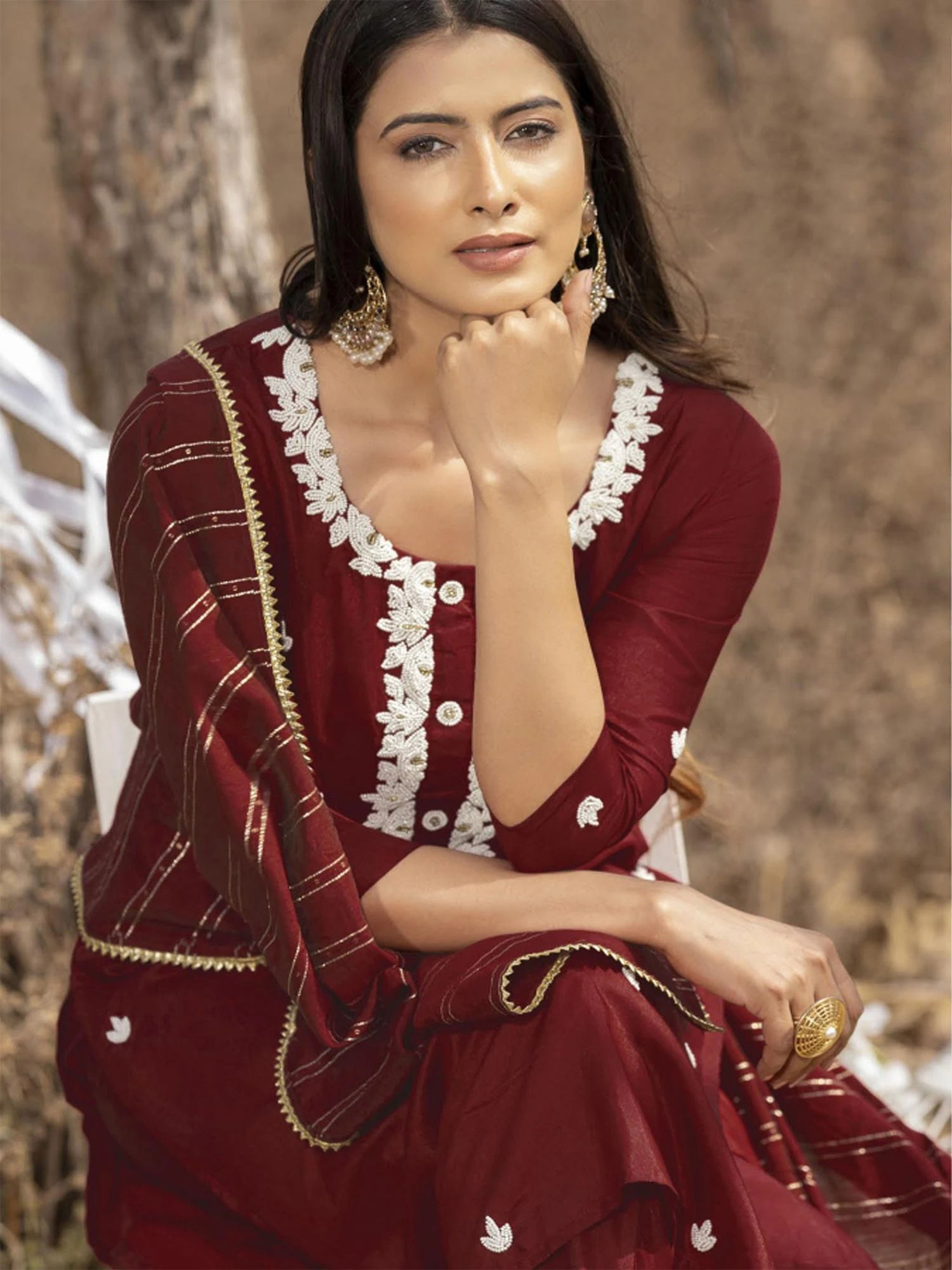 Glam up the views with this maroon color straight cut kameez in cotton. Enhanced using sequins and thread work embroidery all over. Assigned with a cotton dupatta and a pant style bottom, both made in maroon color. Note: Accessories shown are for styling purpose only. Slight color variation may occur due to photographic reasons. The semi-stitched kameez can be customised upto 42 inches.