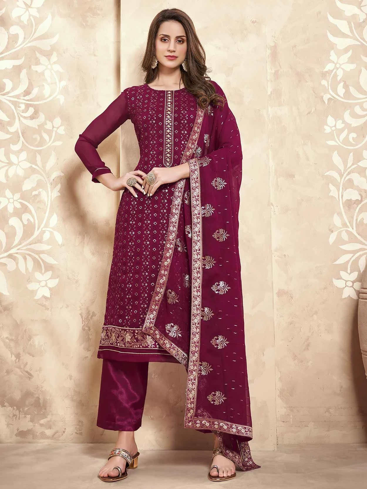 Style and pattern would be at the peak of your attractiveness as soon as you attire this Maroon Colour Georgette Fabric Unstitched Salwar Kameez. The lovely Thread,Embroidery work a substantial attribute of this attire.