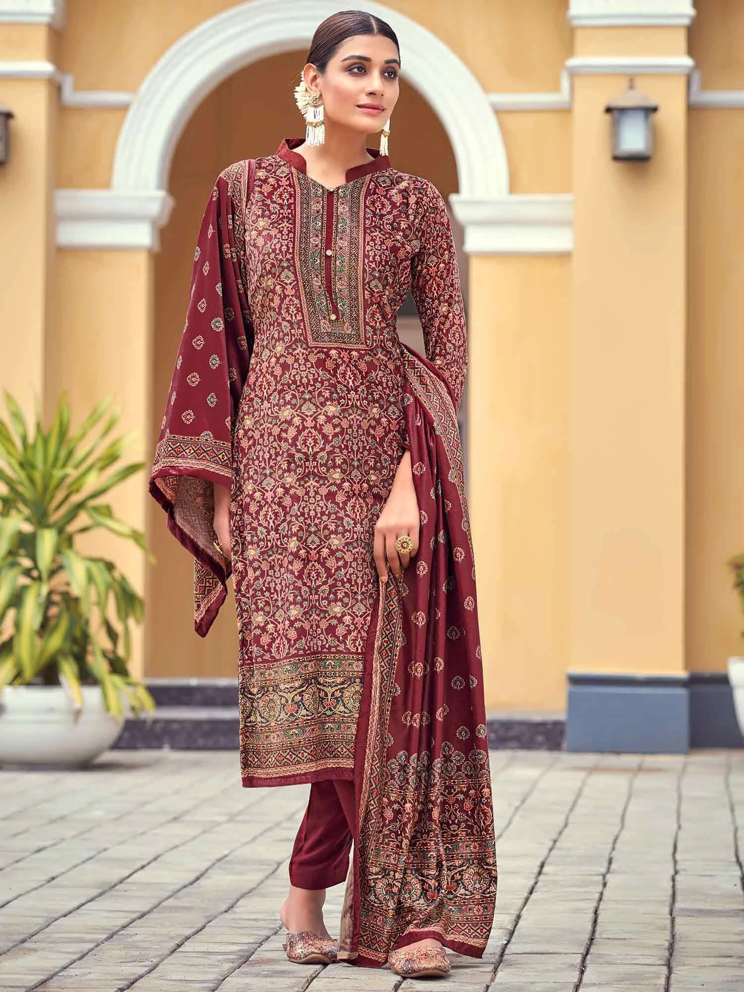 Get a regal look wearing this maroon color straight cut kameez in velvet. Enhanced with floral digital prints all over and stones work. Comes with a matching printed pashmina dupatta and velvet pants. Note: Accessories shown are for styling purpose only. Slight color variation may occur due to photographic reasons. The semi-stitched kameez can be customised upto 42 inches.