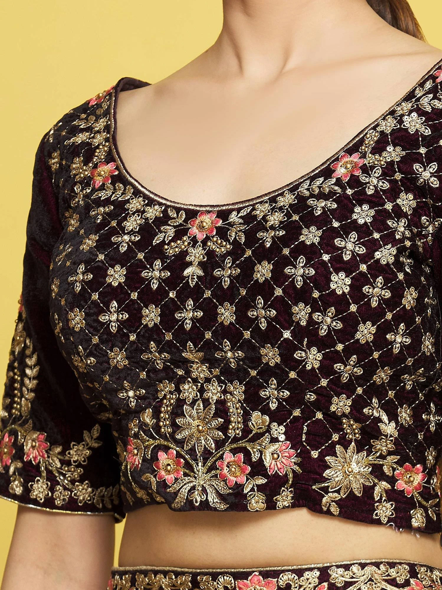 Look all dreamy wearing this mahogany maroon color A-line lehenga in velvet. Decorated with sequins, zari and thread embroidered work all over. Paired with a matching maroon color embroidered choli in velvet and a pink laced dupatta in net. Note: The accessories featured are purely for fashion purposes. Due to photography reasons, some color variations may occur. The semi-stitched choli and lehenga waist may be customized up to 42 inches.
