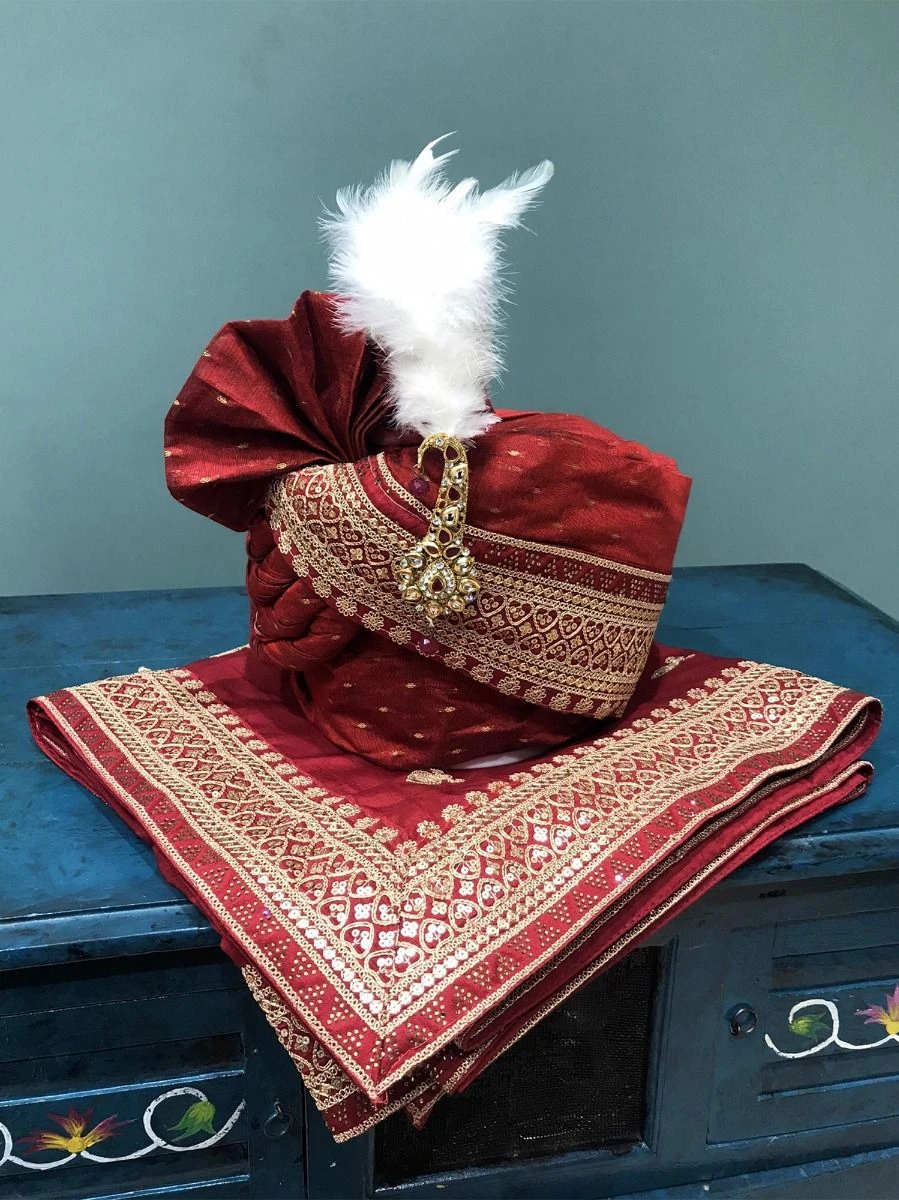 Overwhelm the audience adorning this maroon color readymade safa made in silk. Crafted with a brooch and lace designed using stone and sequins work. Also comes with a matching embroidered dupatta in silk. Note: Slight variation in color and texture may occur due to photographic reasons.