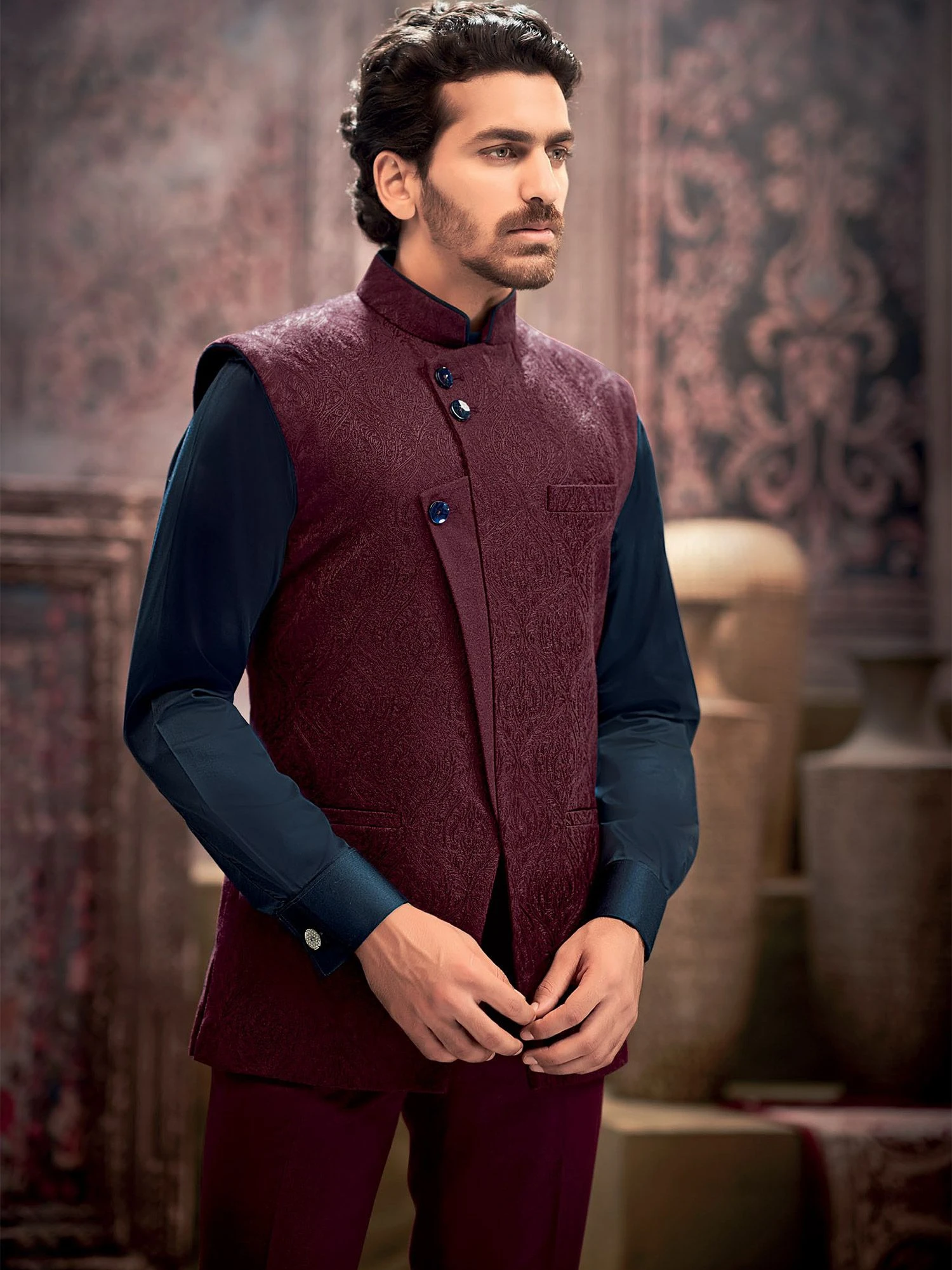 Bring life to the party adorning this maroon color nehru jacket in silk. Furnished with intricate thread embroidery all over. Curated using mandarin collar, buttoned up front and pockets. Note: Some color variations may occur owing to photography causes. Up to 1 inch of measurement fluctuation is possible.