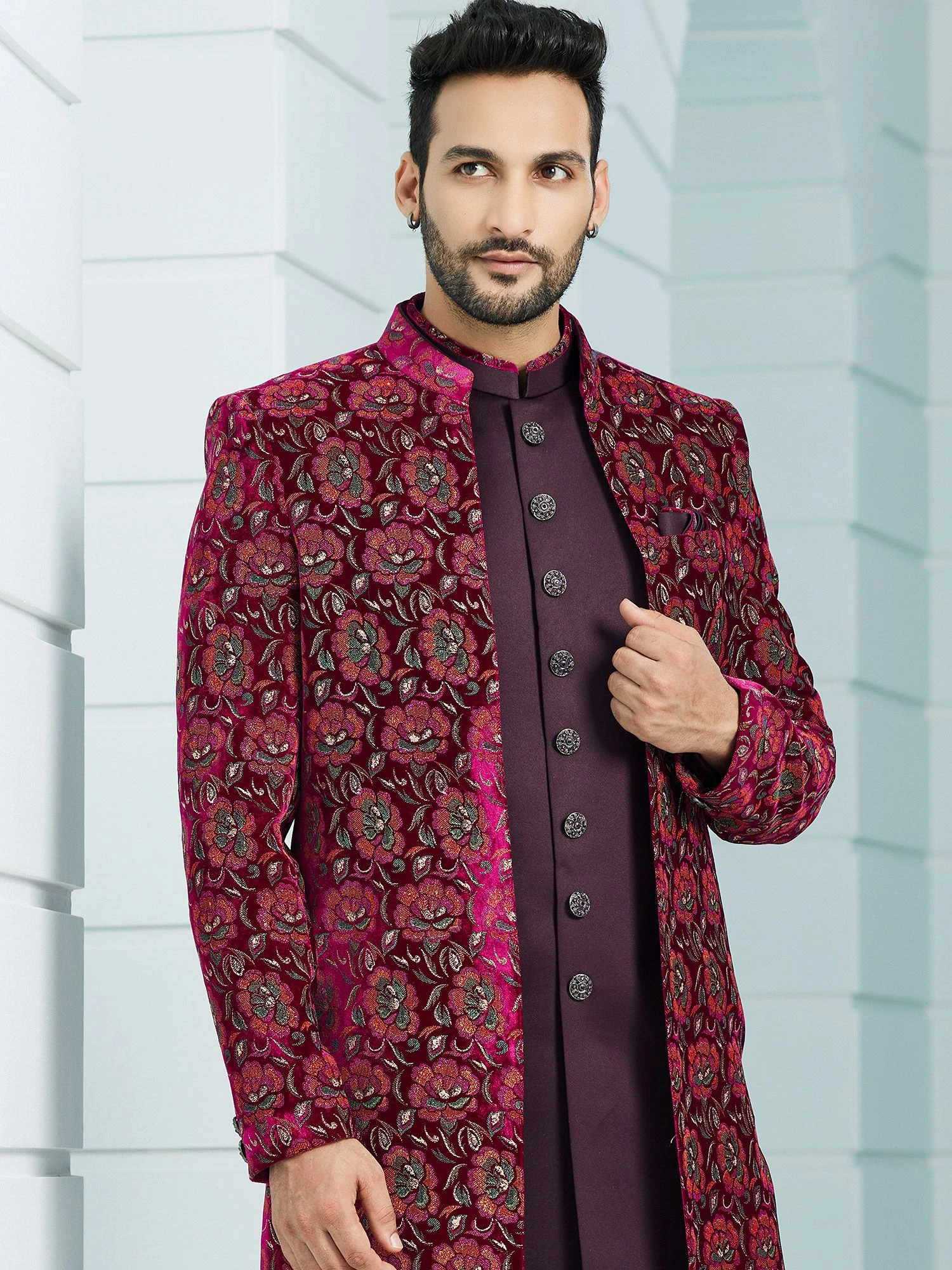 Reflect your glamour personality having this maroon color indowestern made in silk. Augmented using floral woven pattern embellishment work. Paired with blue maroon churidaar and a jacket in silk. Note: Some color variations may occur owing to photography causes. Up to 1 inch of measurement fluctuation is possible.