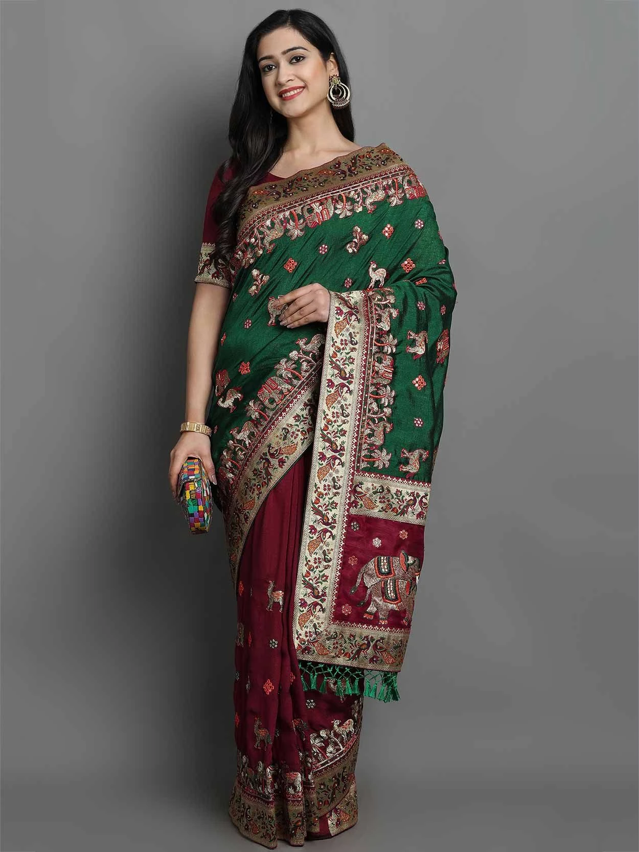 True magnificence comes out as a result of the dressing style with this Maroon,Green Colour Vichitra Silk Fabric Saree. The ethnic Thread Work work at the clothing adds a sign of attractiveness statement with your look.