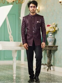 Take your fashion game one level higher by adorning this wine maroon color bandhgala suit made in silk. Topped with a embroidered jacket in silk. Paired with a matching black pant in silk. Note: Some color variations may occur owing to photography causes. Up to 1 inch of measurement fluctuation is possible.