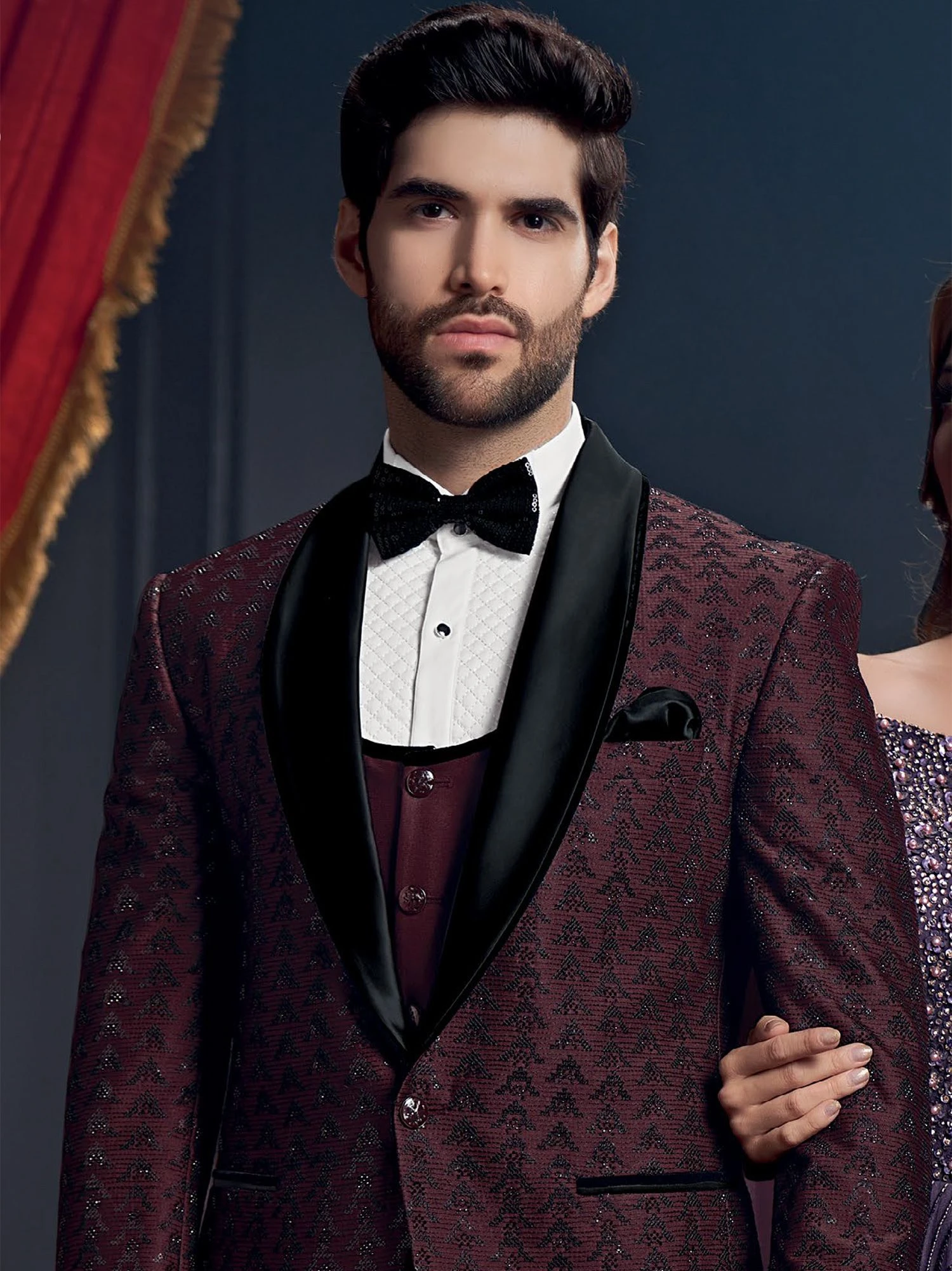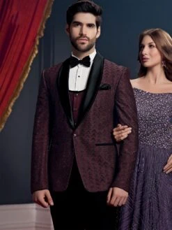 Steal the spotlight adorning this dark maroon color tuxedo made in italian fabric. Augmented with stone work embellishments and embroidery. Paired with a white cotton shirt, bow tie and a matching black trousers. Note: Some color variations may occur owing to photography causes. Up to 1 inch of measurement fluctuation is possible.