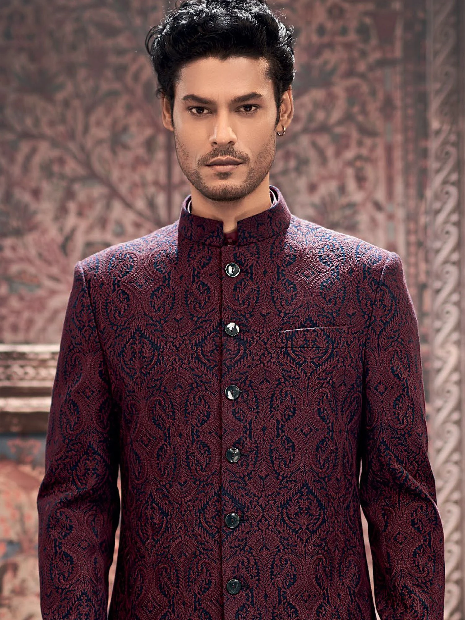 Embrace your traditions adorning this maroon color indo western made in silk. Designed using thread embroidery work all over with a buttoned up front. Teamed with a blue color trousers in silk. Note: Some color variations may occur owing to photography causes. Up to 1 inch measurement fluctuation is possible.