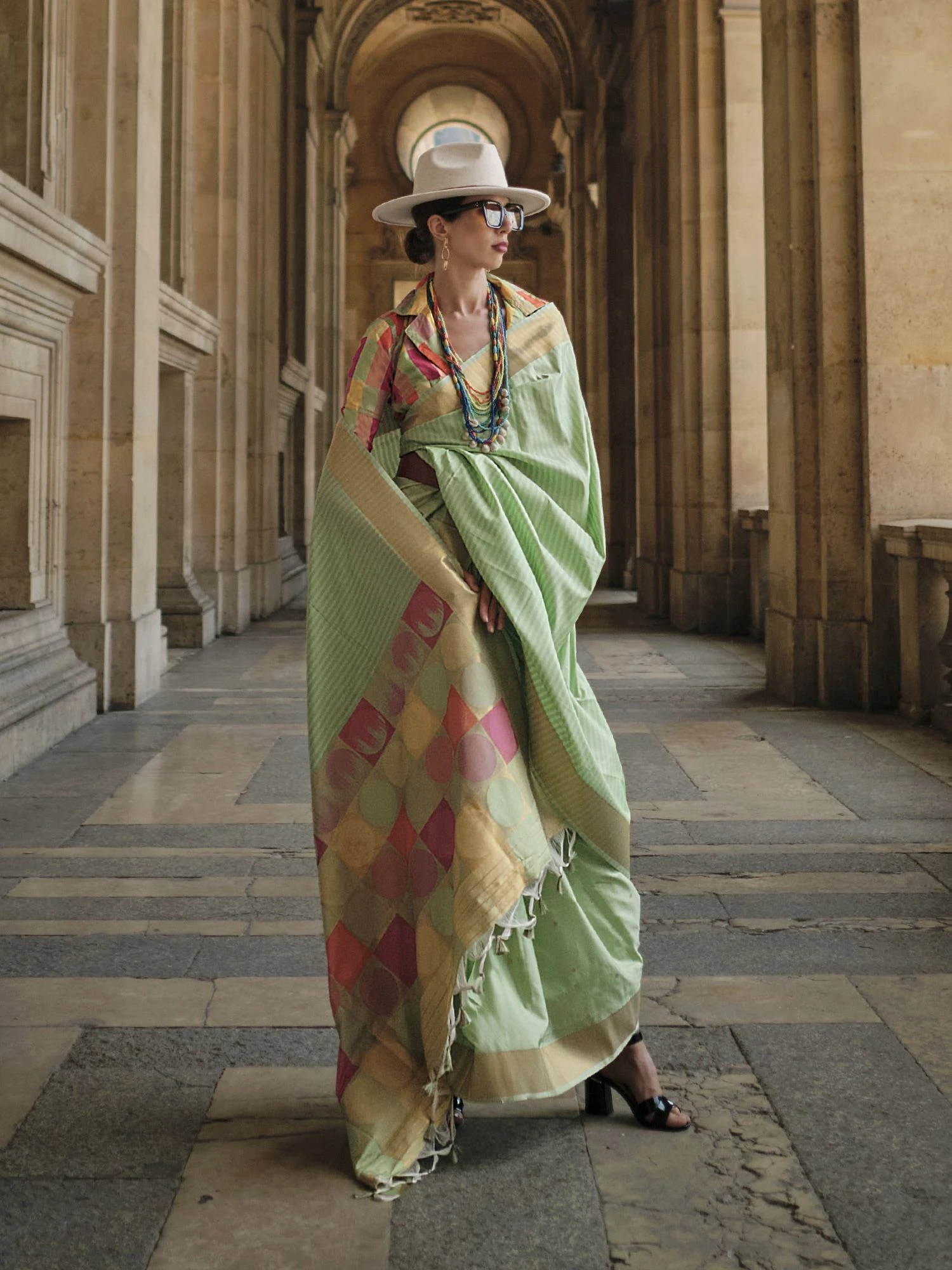 Give a glamorous glance wearing this mint green color saree crafted in silk. Enhanced using woven patterns, showcasing distinstive borders and pallu. Comes with a matching multicolor blouse in silk. Note: The accessories featured are purely for fashion purposes. Due to photography reasons, some color variations may occur. The un-stitched blouse may be customized up to 42 inches.