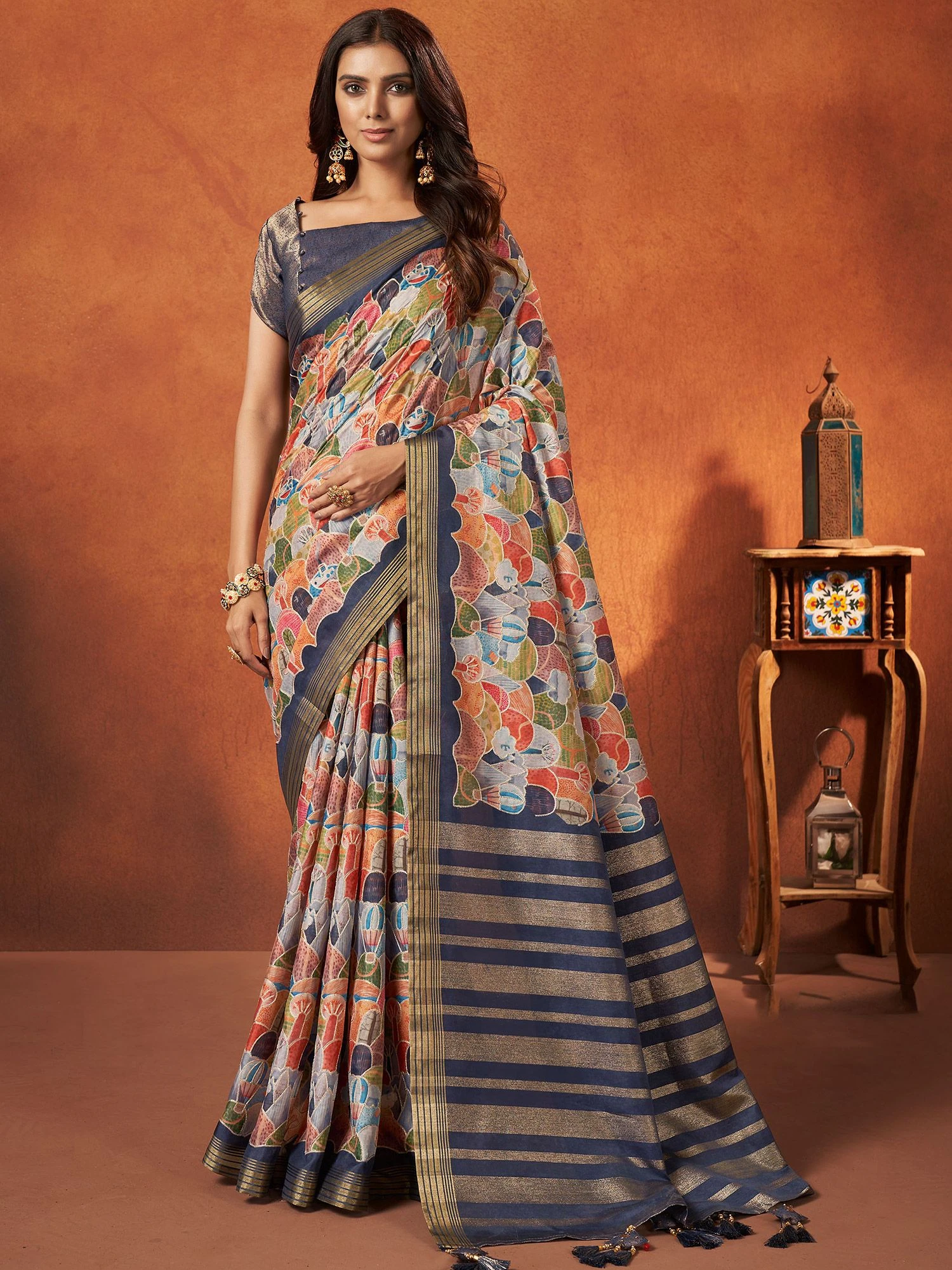 Exude major regal vibes adorning this multicolor saree made in crepe silk. Furnished using printed patterns, showcasing distinstive borders and pallu. Comes with a matching blue color blouse in brocade jacquard. Note: The accessories featured are purely for fashion purposes. Due to photography reasons, some color variations may occur. The un-stitched blouse may be customized up to 42 inches.