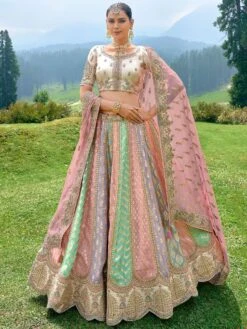 Shine brighter wearing this light multicolor designer lehenga in fancy silk. Decorated with mirror, stones and zari woven with zari embroidered work. Paired with a matching cream color embroidered choli in pure silk and rose pink color dupatta, made in soft silk. Note: The accessories featured are purely for fashion purposes. Due to photography reasons, some color variations may occur. The semi-stitched choli and lehenga waist may be customized up to 42 inches.