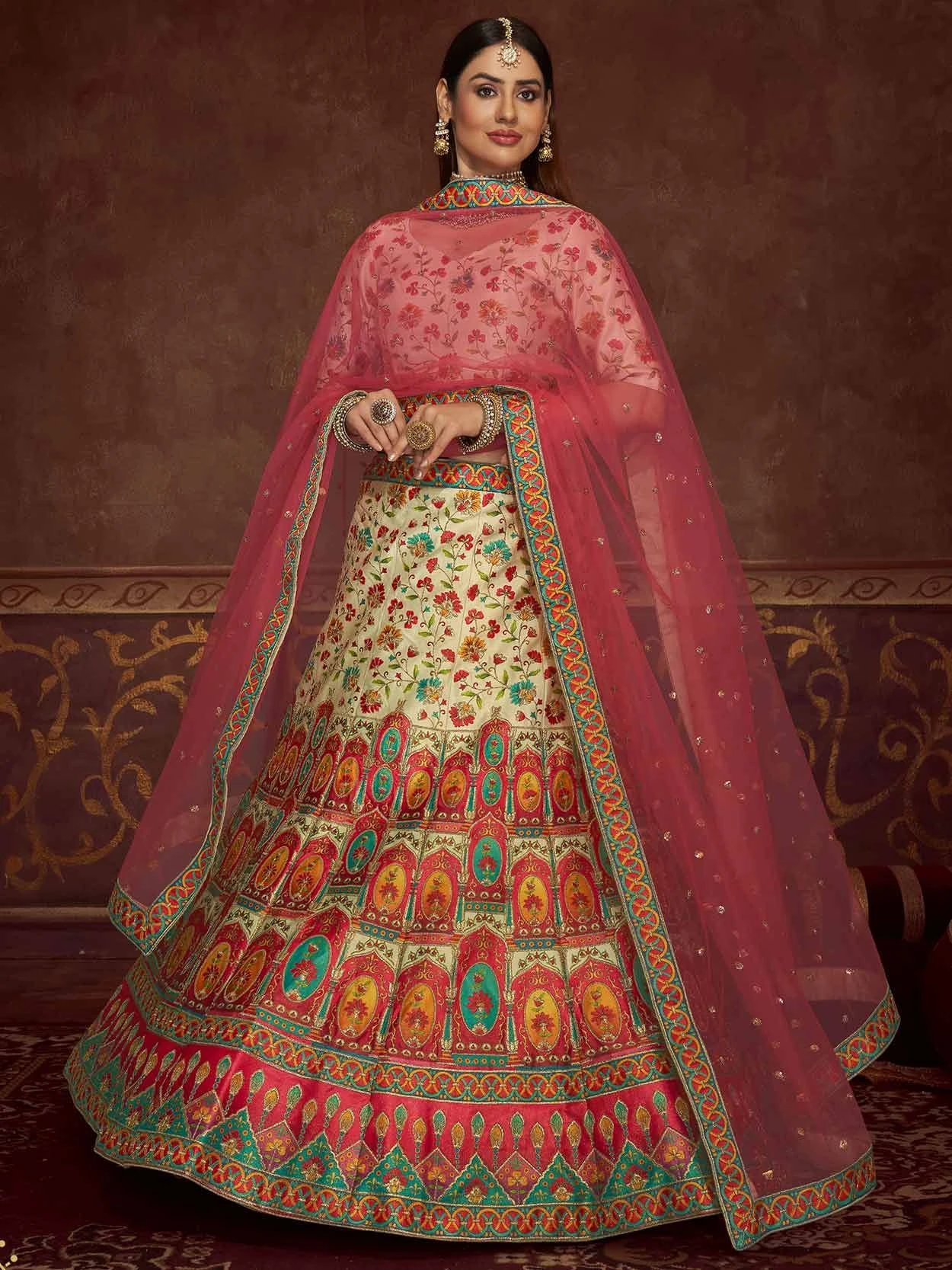 Charm all hearts donning in this multicolor festive lehenga crafted in art silk. Furnished with floral themed prints all over and intricate zari, thread, embroidered work. Assembled with a matching cream color choli in art silk and a pink laced net dupatta, both embellished in similar work. Please keep in mind that the accessories featured are purely for fashion purposes. Due to photography reasons, some color variations may occur. The semi-stitched choli and lehenga waist may be customized up to 42 inches.