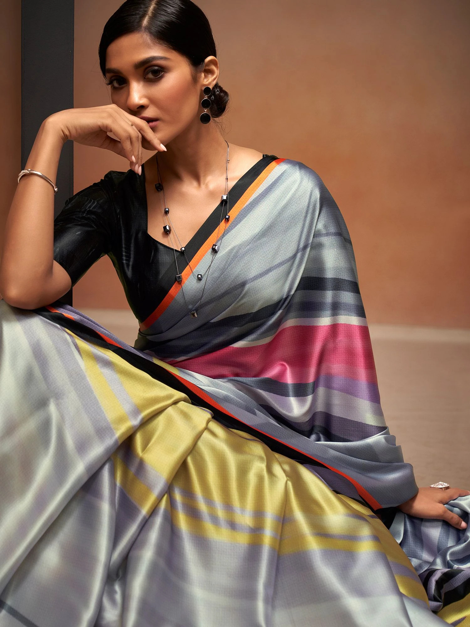 Take your party look to a notch higher wearing this multicolor saree crafted in satin. Decorated using digital printed patterns all over. Comes with a contrast matching black color printed blouse in satin. Note: The accessories featured are purely for fashion purposes. Due to photography reasons, some color variations may occur. The un-stitched blouse may be customized up to 42 inches.