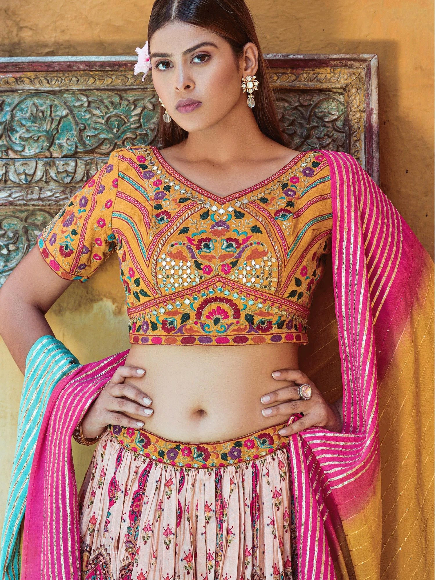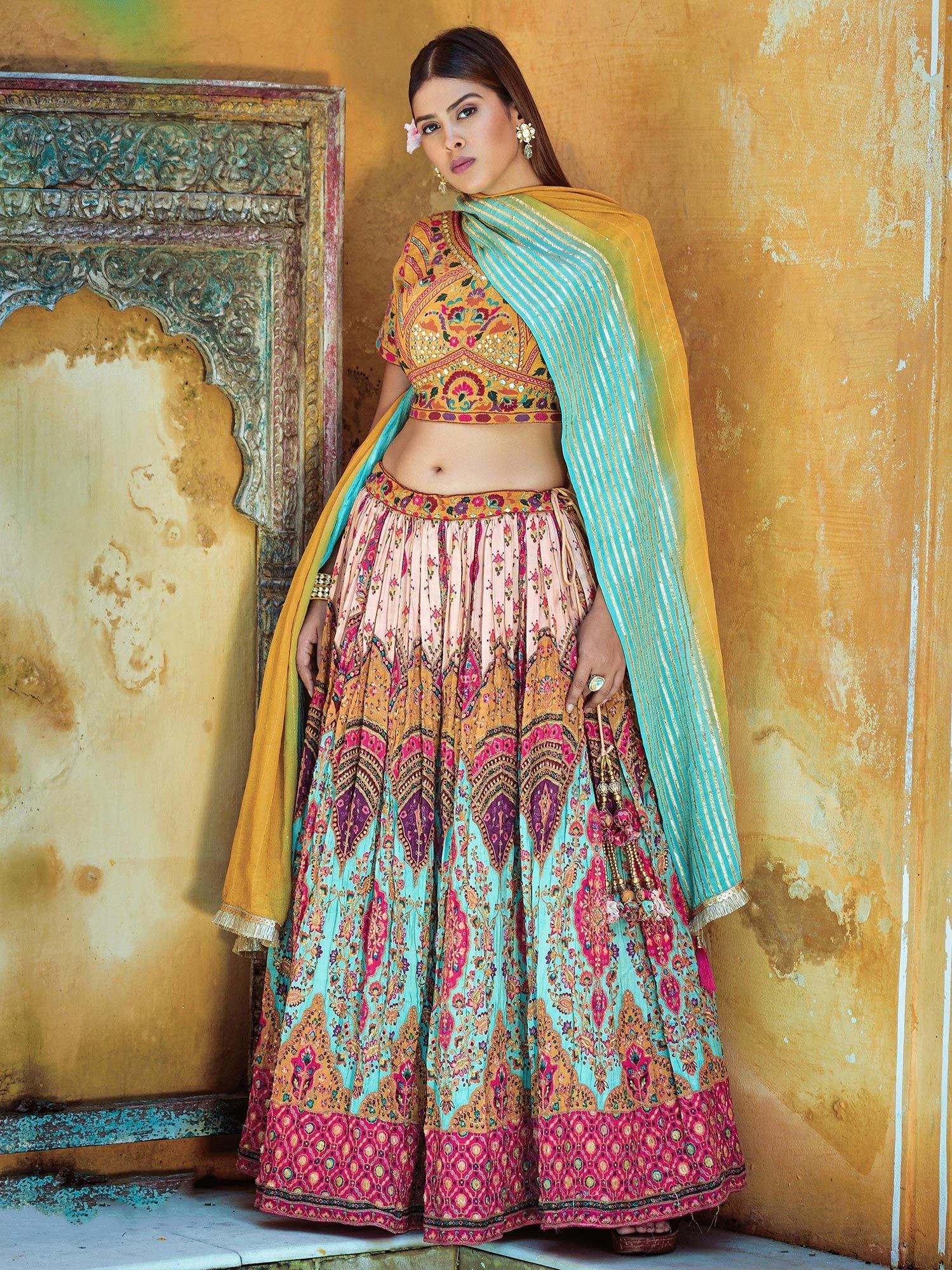 Exude a sense of magnificence wearing this multicolor lehenga in viscose. Furnished with printed patterns all over, stone, zari and thread embroidered work. Paired with a matching yellow color embroidered choli and a multicolor printed dupatta made in viscose. Note: The accessories featured are purely for fashion purposes. Due to photography reasons, some color variations may occur. The semi-stitched choli and lehenga waist may be customized up to 42 inches.
