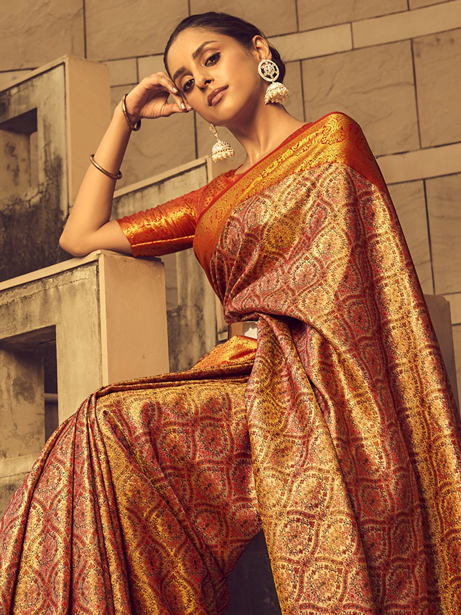 Spread the essence of grace and femininity with this multicolor color saree crafted in silk. Crafted using zari woven patterns, showcasing distinstive borders and pallu. Comes with a matching color woven blouse in silk. Note: The accessories featured are purely for fashion purposes. Due to photography reasons, some color variations may occur. The un-stitched blouse may be customized up to 42 inches.