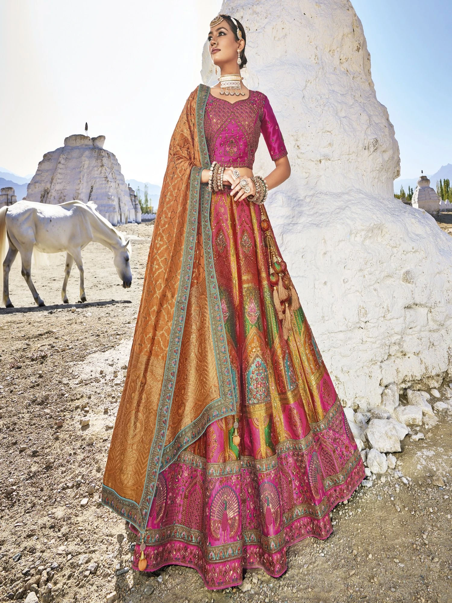 Overwhelm the audience as you wear this dark pink color lehenga made in banarsi silk, jacquard. Augmented with sequins, stone and zari with thread embroidered and printed work. Paired with a matching pink color embroidered choli in satin and ochre yellow color designer dupatta, made in viscose georgette. Note: The accessories featured are purely for fashion purposes. Due to photography reasons, some color variations may occur. The semi-stitched choli and lehenga waist may be customized up to 42 inches.