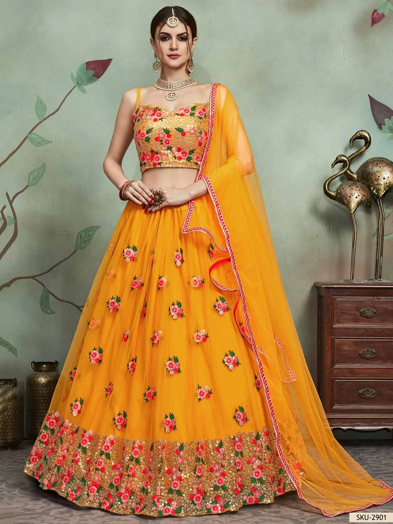 Mustard Yellow Colour Net Fabric Attractive Unstitched Lehenga Choli This attire is nicely made with Thread,Sequin work.