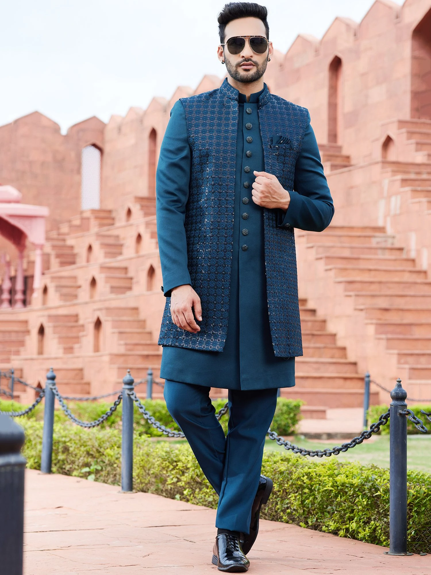 Experience the art of self-expression adorning this royal blue color jacketed indowestern sherwani made in italian fabric. Augmented using sequins, thread embroidery work. Paired with matching blue color pant in silk. Note: Some color variations may occur owing to photography causes. Up to 1 inch of measurement fluctuation is possible.