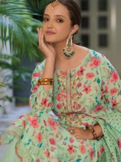 Bedazzle everyone around you wearing this navy blue color anarkali style kameez in chinon silk. Enhanced using sequins, stone with zari work embroidery all over. Assigned with a chinon silk dupatta and a palazzo style bottom, both made in navy blue color. Note: Accessories shown are for styling purpose only. Slight color variation may occur due to photographic reasons. The semi-stitched kameez can be customised upto 42 inches.