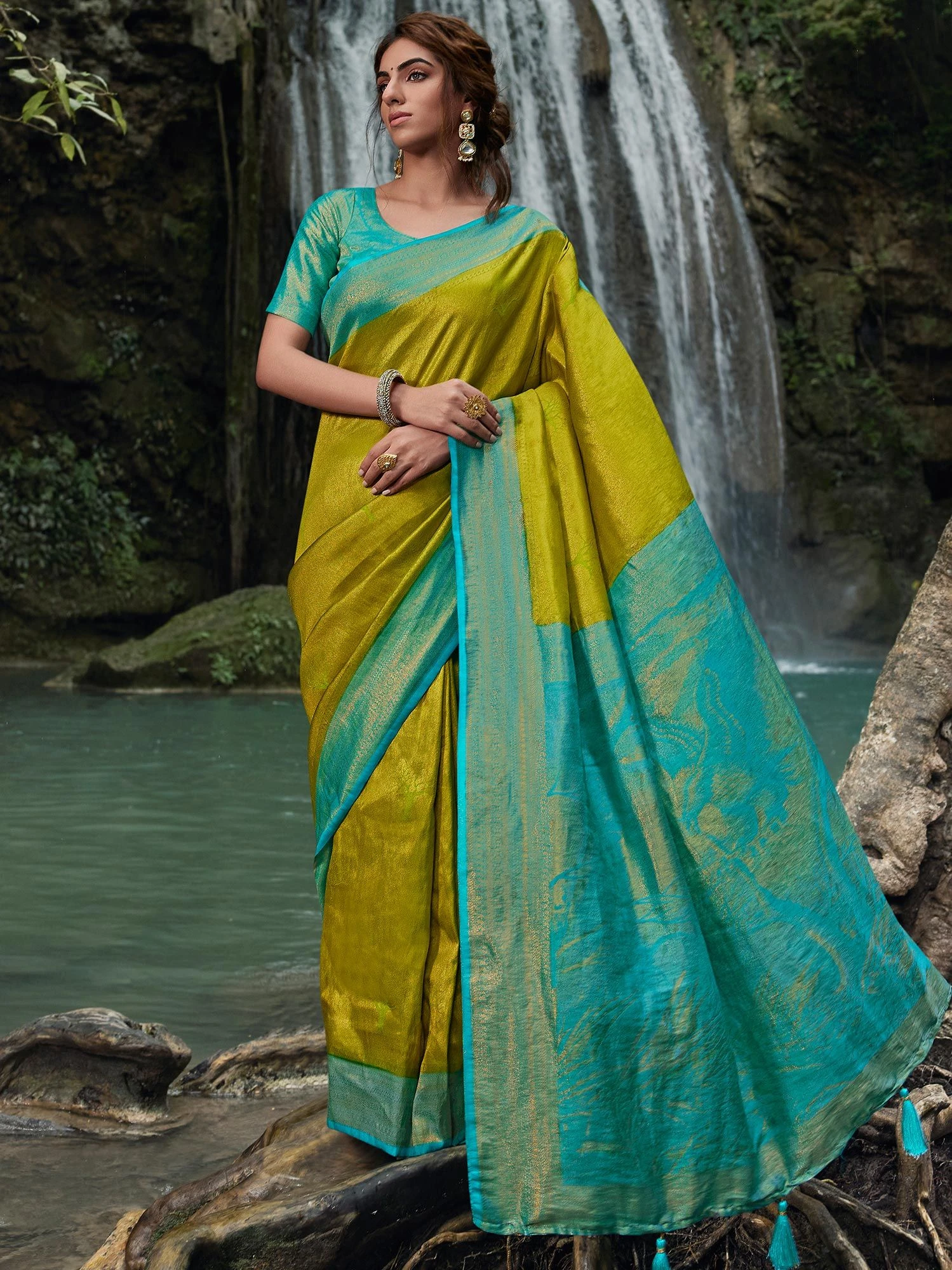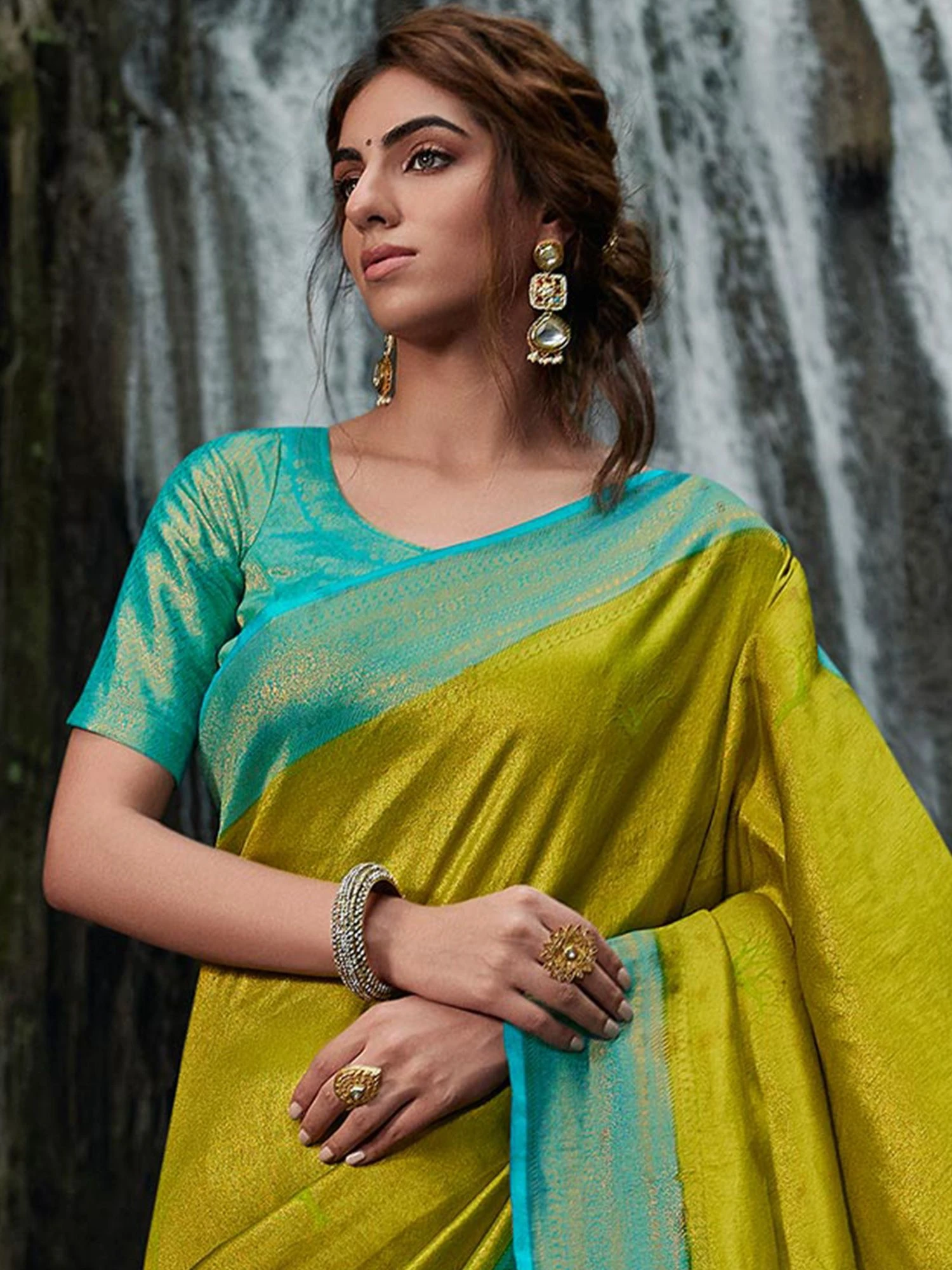 Exude festive vibes adorning this neon green color saree made in silk. Crafted with woven patterns using zari, showcasing distinstive borders and pallu. Assembled with a matching bright blue color woven blouse in silk. Note: The accessories featured are purely for fashion purposes. Due to photography reasons, some color variations may occur. The un-stitched blouse may be customized up to 42 inches.