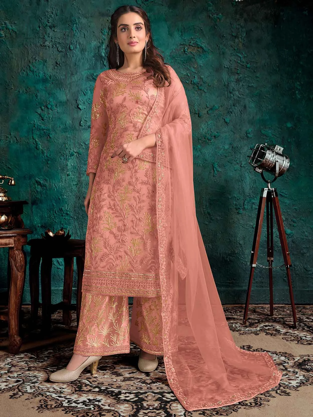 Rust Colour Net Fabric Beautiful Semi Stitched Salwar Kameez The lovely Zari,Thread,Sequins Work work a substantial attribute of this attire.
