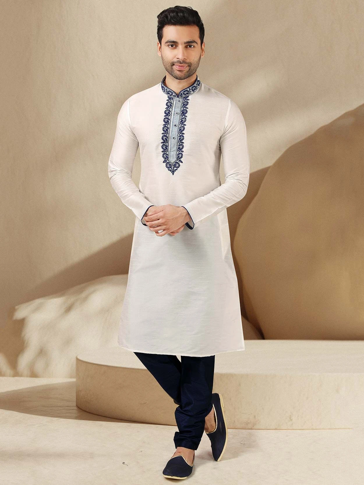 Equally classic and modern, this splendid Off White Colour Banarasi Art Silk Fabric Readymade Kurta Pajama.