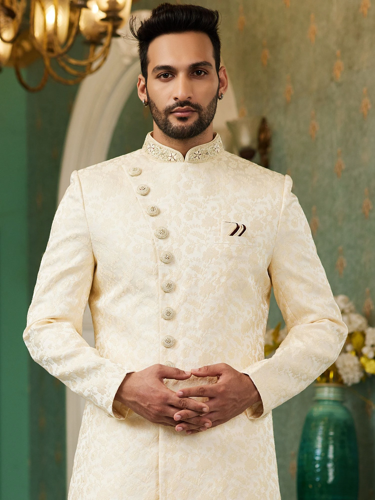 Make an everlasting impression adorning this off white color sherwani fabricated in jacquard. Designed using weaving embroidery work. Paired with white color churidar in dupion silk. Note: Some color variations may occur owing to photography causes. Up to 1 inch of measurement fluctuation is possible.