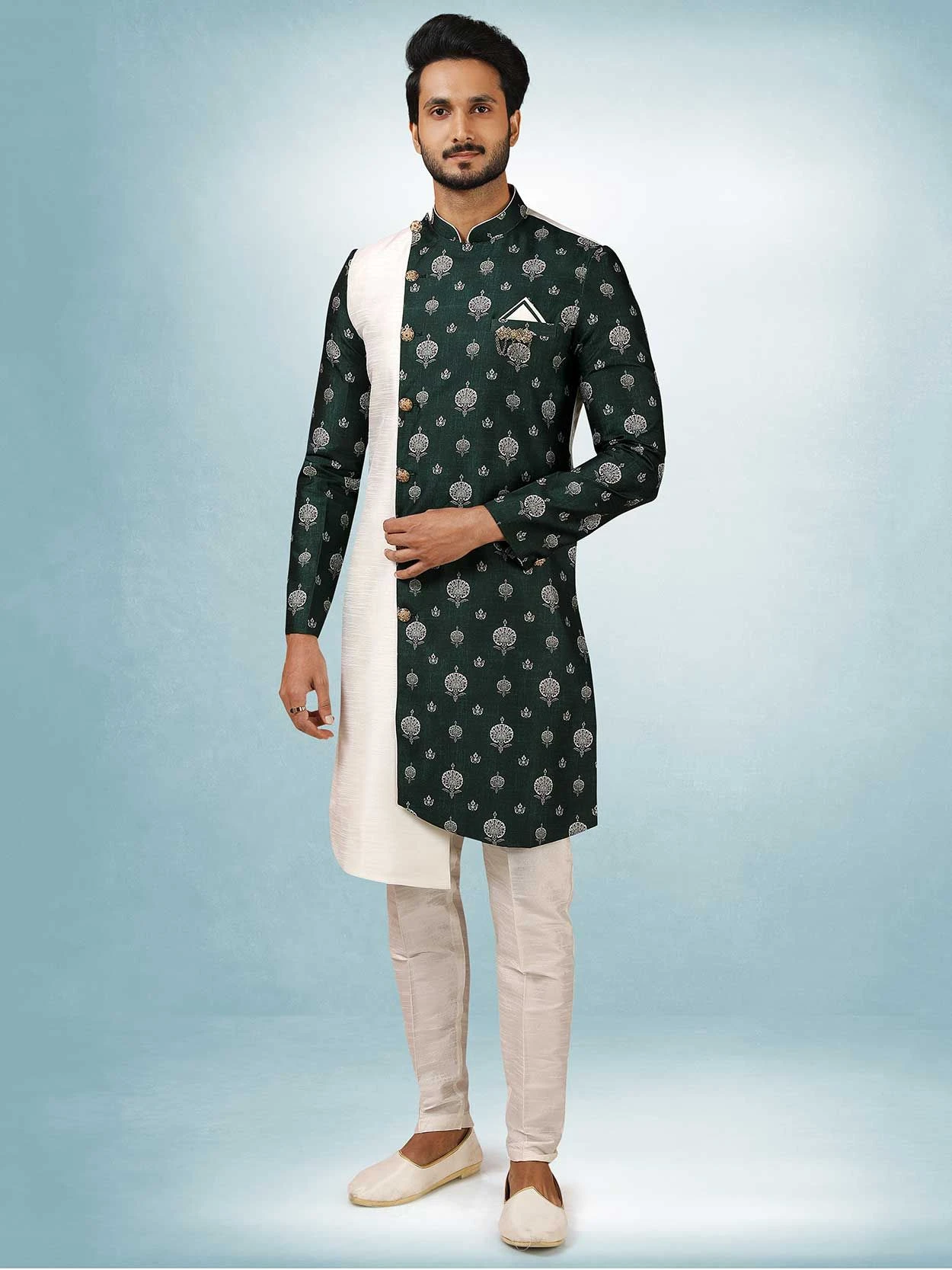 An charmingly styled Off White,Green Colour Art Silk Fabric Men’s Designer Indo Western that is excellent for all ethnic functions. All patterns are intricately embellished with Pattern Pcs,Printed Work work.