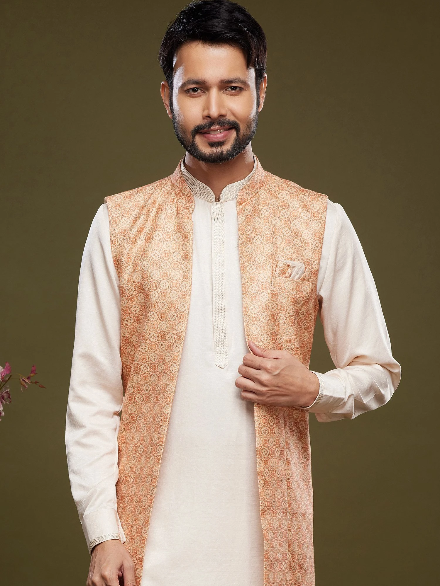 Wear your style boldly adorning this off white color kurta made in banarasi art silk. Topped with a long printed orange jacket in satin. Elevated with madarin collar, placket and bottoned sleeves. Comes with a off white color straight pajama in art silk. Note: Some color variations may occur owing to photography causes. Up to 1 inch of measurement fluctuation is possible.