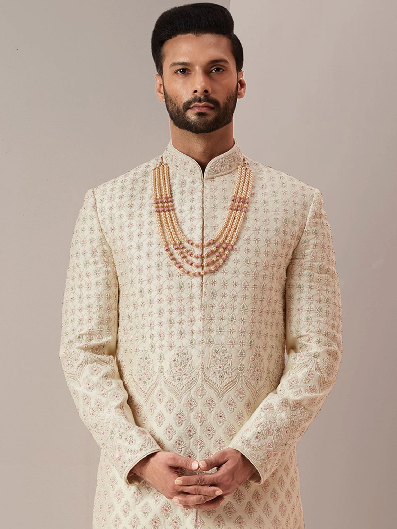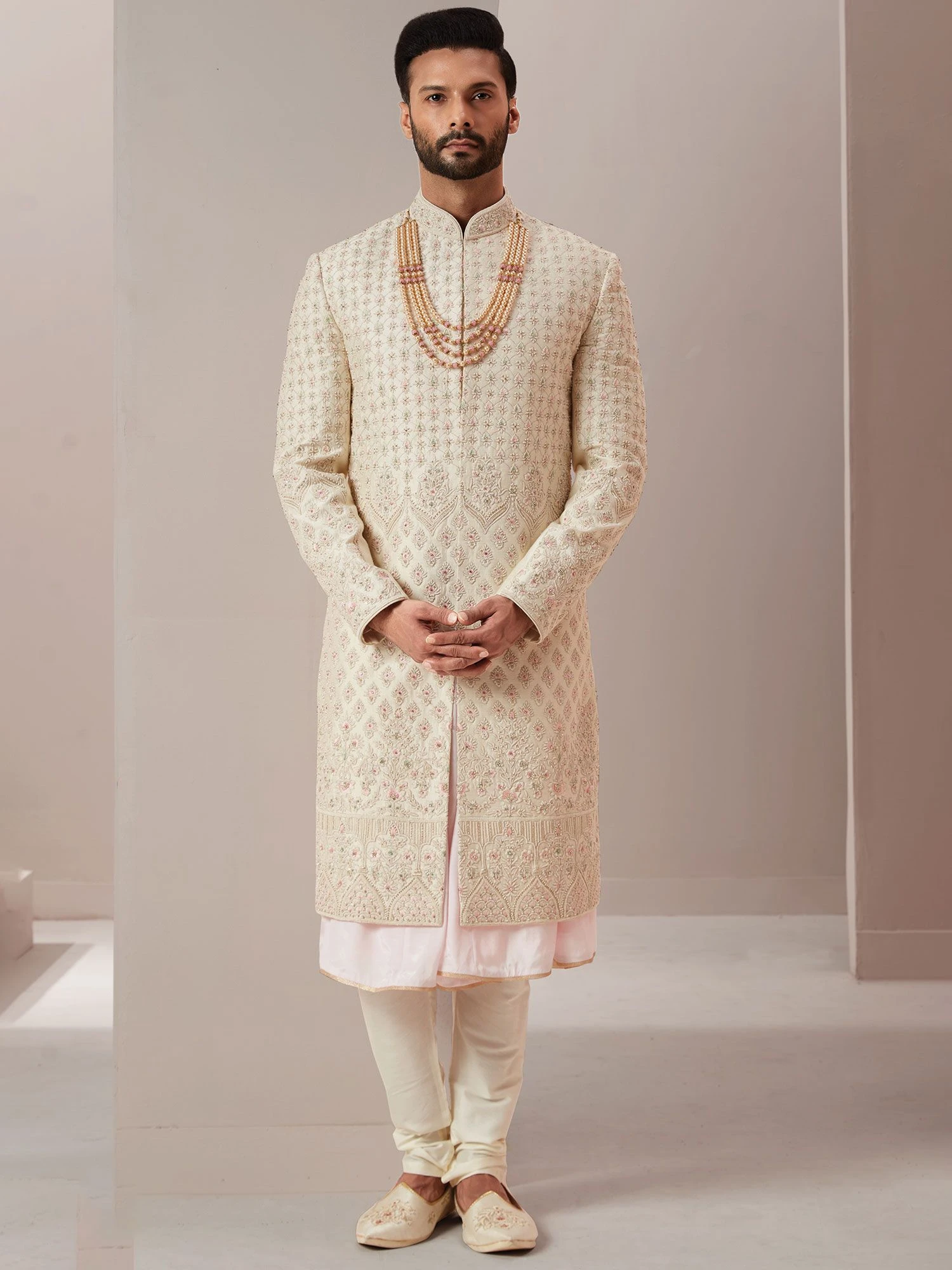 Be the centre of the party adorning this off-white color sherwani made in silk. Decked with thread work, hand work embroidery and zardozi embellishment work. Paired with white color churidaar in silk and a matching kurta underneath. Note: Some color variations may occur owing to photography causes. Up to 1 inch of measurement fluctuation is possible.