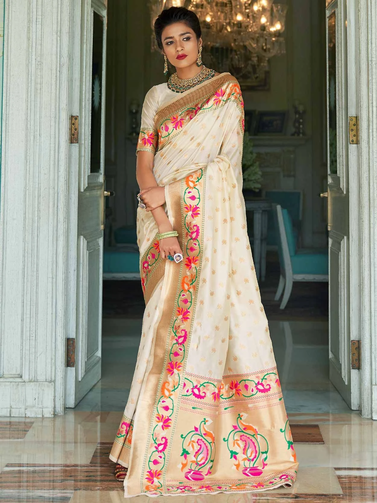 Charm all hearts adorning this off-white color festive saree crafted in handloom silk. Furnished using floral woven patterns, showcasing distinstive borders and pallu. Comes with a matching off-white color blouse in silk. Please keep in mind that the accessories featured are purely for fashion purposes. Due to photography reasons, some color variations may occur. The un-stitched blouse may be customized up to 42 inches.