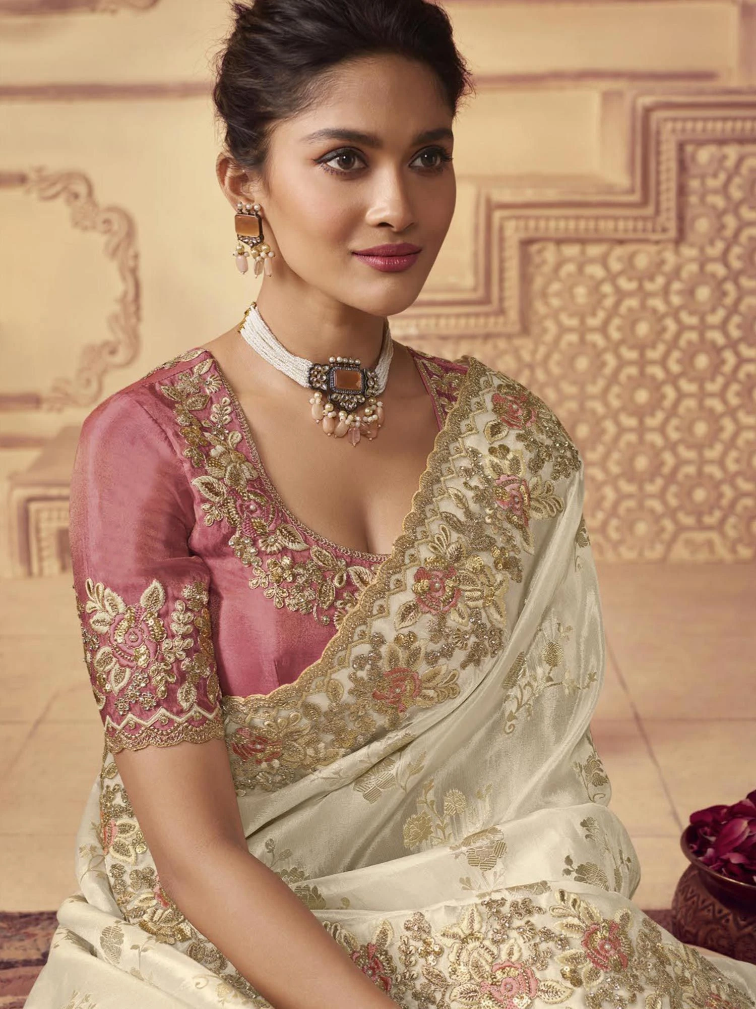 Evoke the fashionista in you donning in this off-white color saree crafted in art silk. Furnished using zari woven patterns all over, showcasing distinstive borders enhanced with fine hand work embroidery. Teamed with a matching pink color blouse in art silk. Note: The accessories featured are purely for fashion purposes. Due to photography reasons, some color variations may occur. The un-stitched blouse may be customized up to 42 inches.