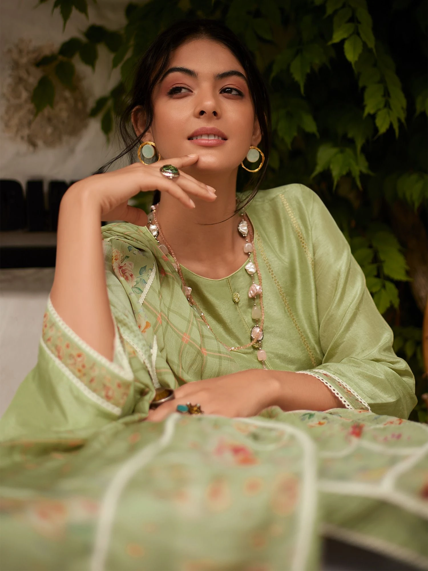 Capture the symbol of confidence and charm with this olive green color straight cut kameez in art silk. Designed using floral digital printed work all over. Paired with a art silk dupatta and a palazzo style bottom, both made in green color. Note: Accessories shown are for styling purpose only. Slight color variation may occur due to photographic reasons. The semi-stitched kameez can be customised upto 42 inches.