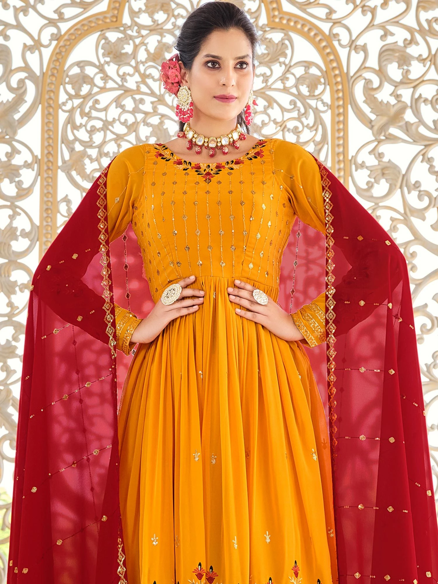 Take your ethnic look to a notch higher adorning this orange color flared kameez in georgette. Enhanced using sequins and thread work embroidery all over. Paired with a red color embroidered dupatta in georgette and a matching palazzo. Note: Accessories shown are for styling purpose only. Slight color variation may occur due to photographic reasons. The semi-stitched kameez can be customised upto 42 inches.